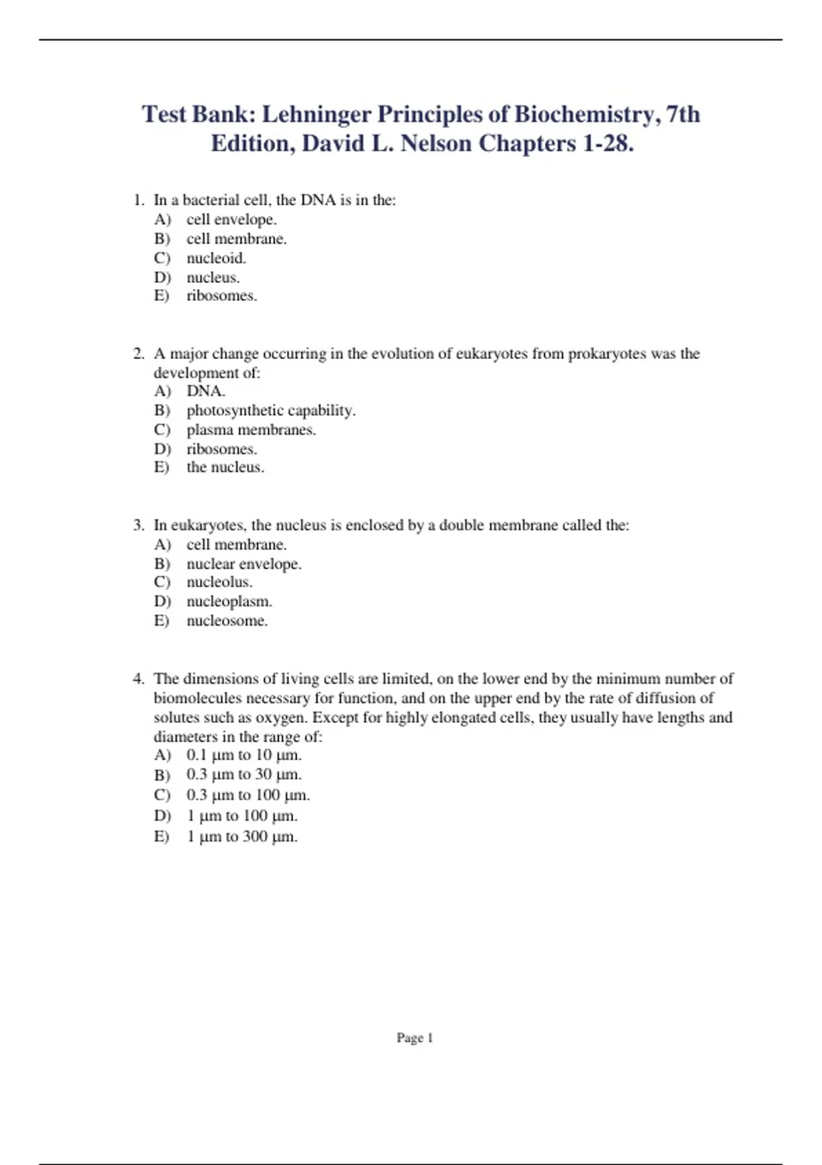 Test Bank: Lehninger Principles of Biochemistry, 7th