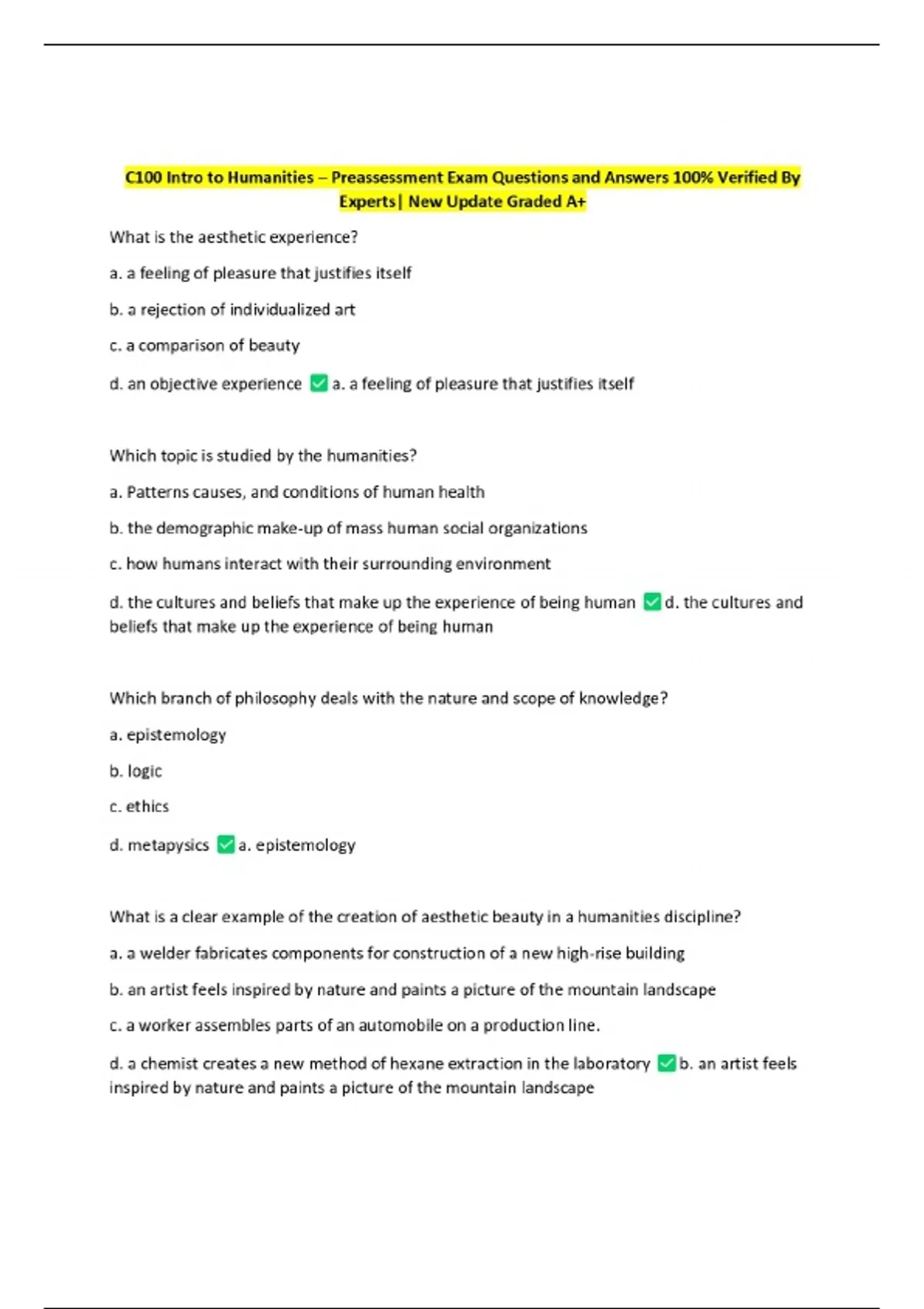 C100 Intro to Humanities – Preassessment Exam Questions and Answers 100% Verified By Experts| New Update Graded A+