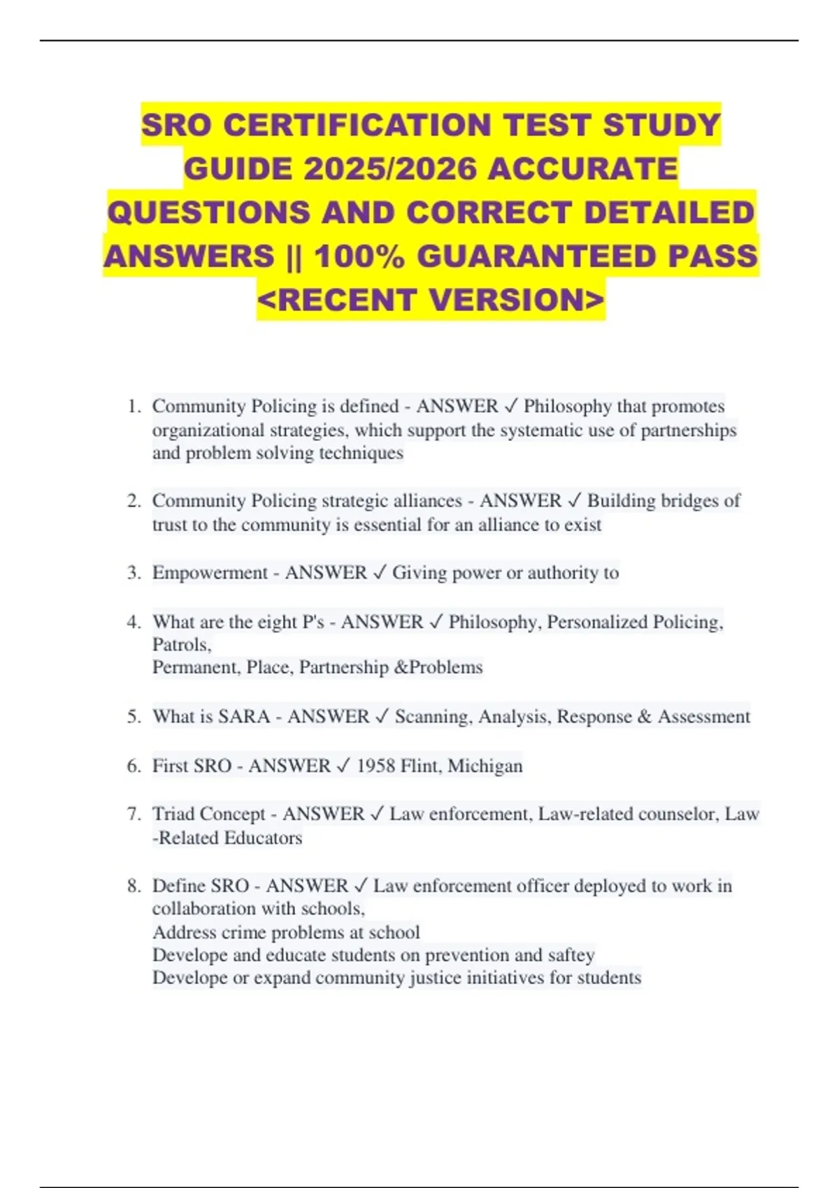 1. Community Policing is defined - ANSWER ✓ Philosophy that promotes