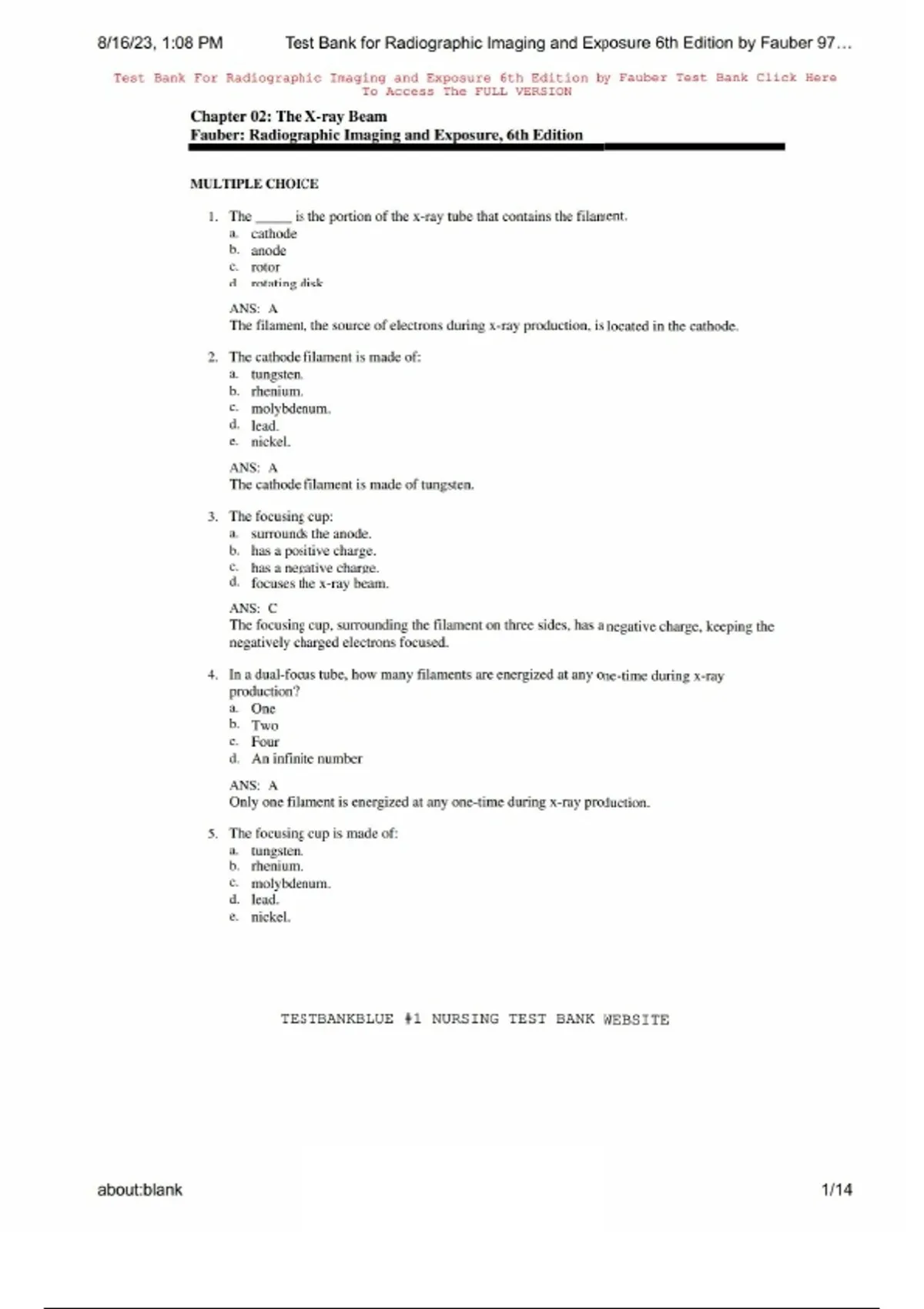 test bank for radiographic imaging and exposure 6t