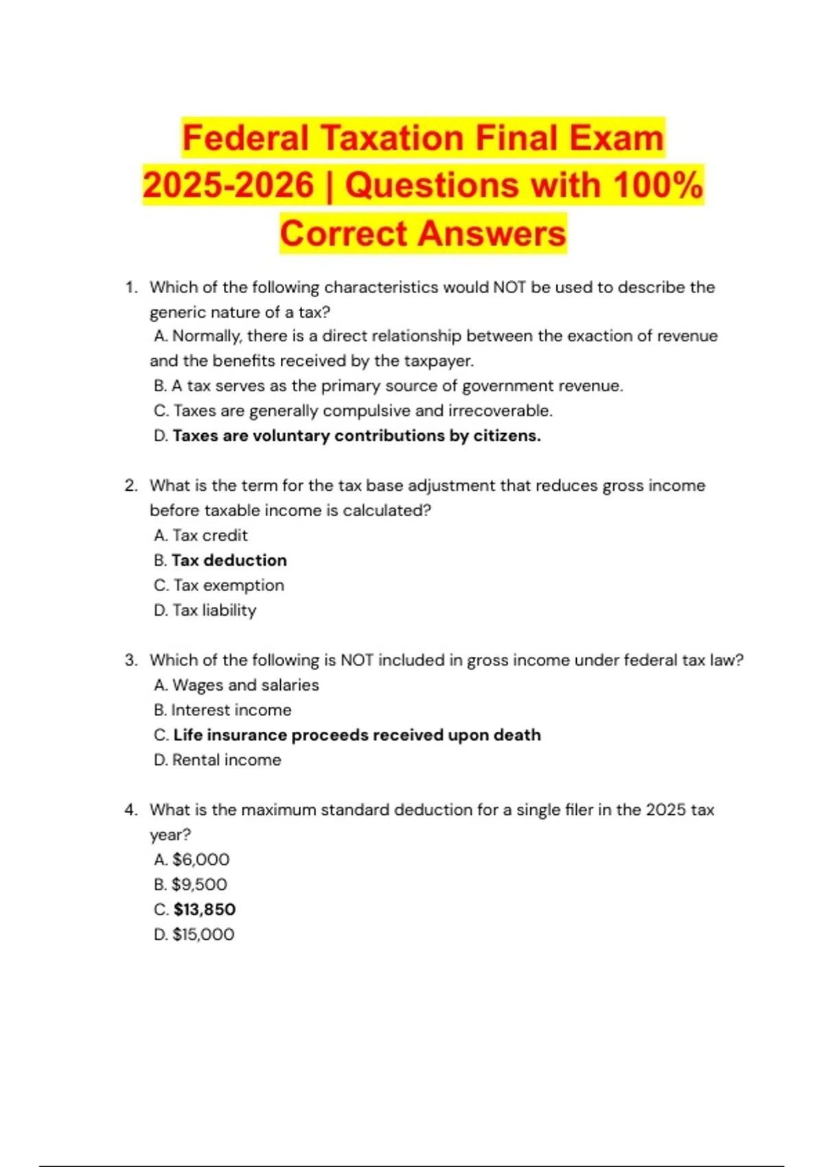 Federal Taxation Final Exam 2025 Review - Questions and Answers