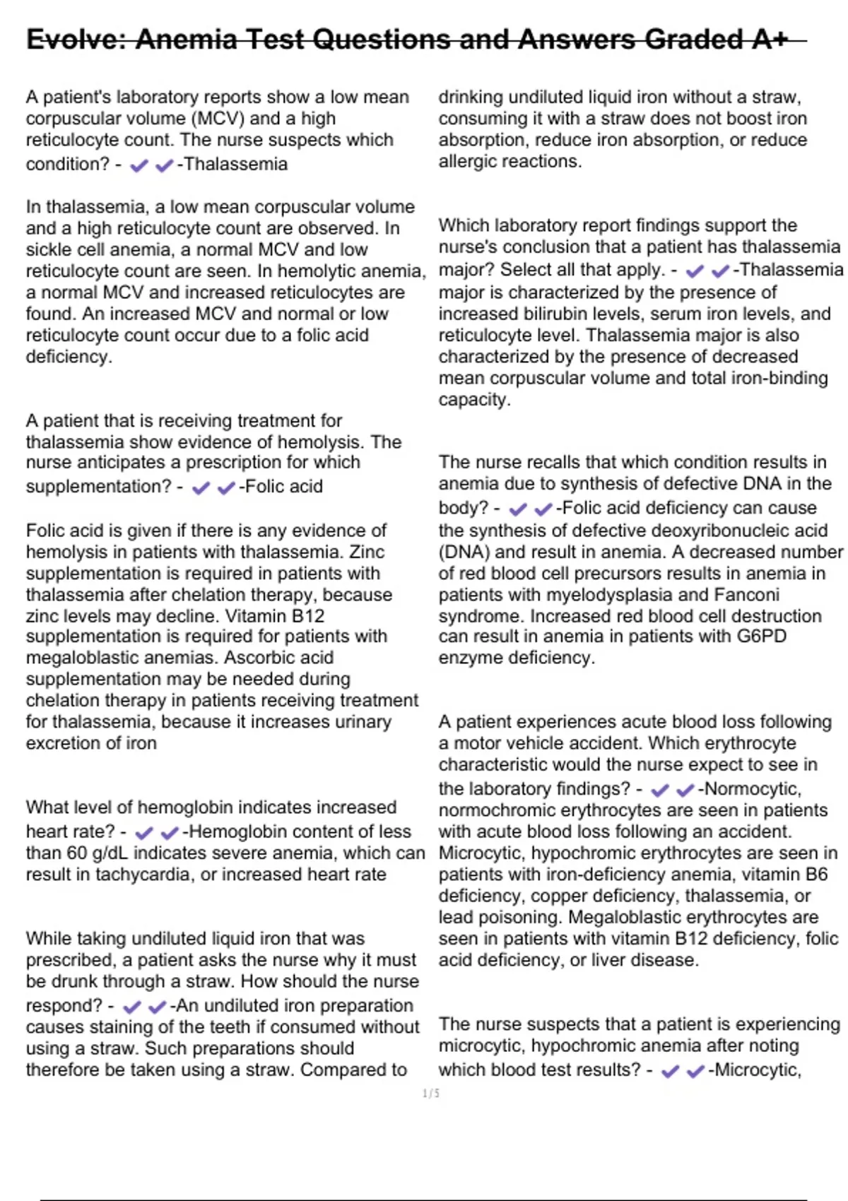 , Evolve: Anemia Test Questions and Answers Graded A+
