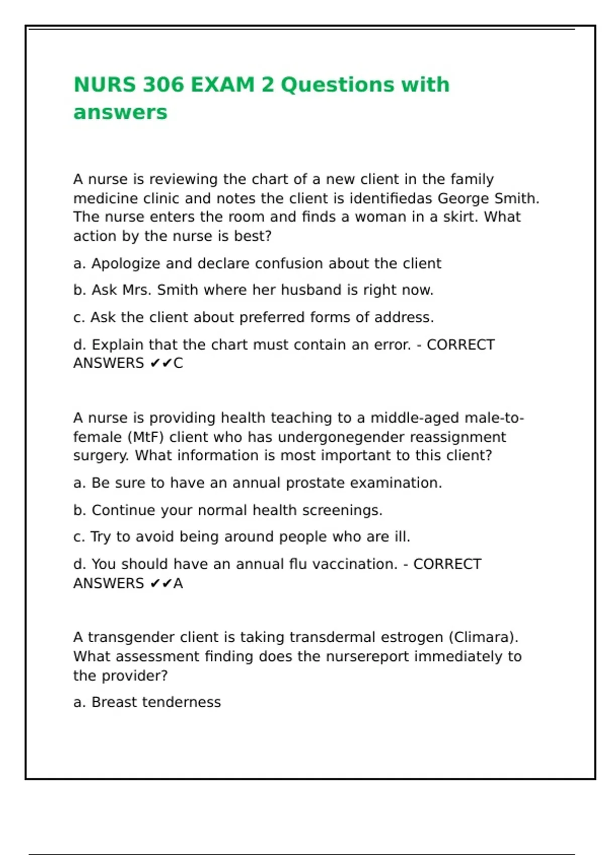 NURS 306 EXAM 2 Questions with answers