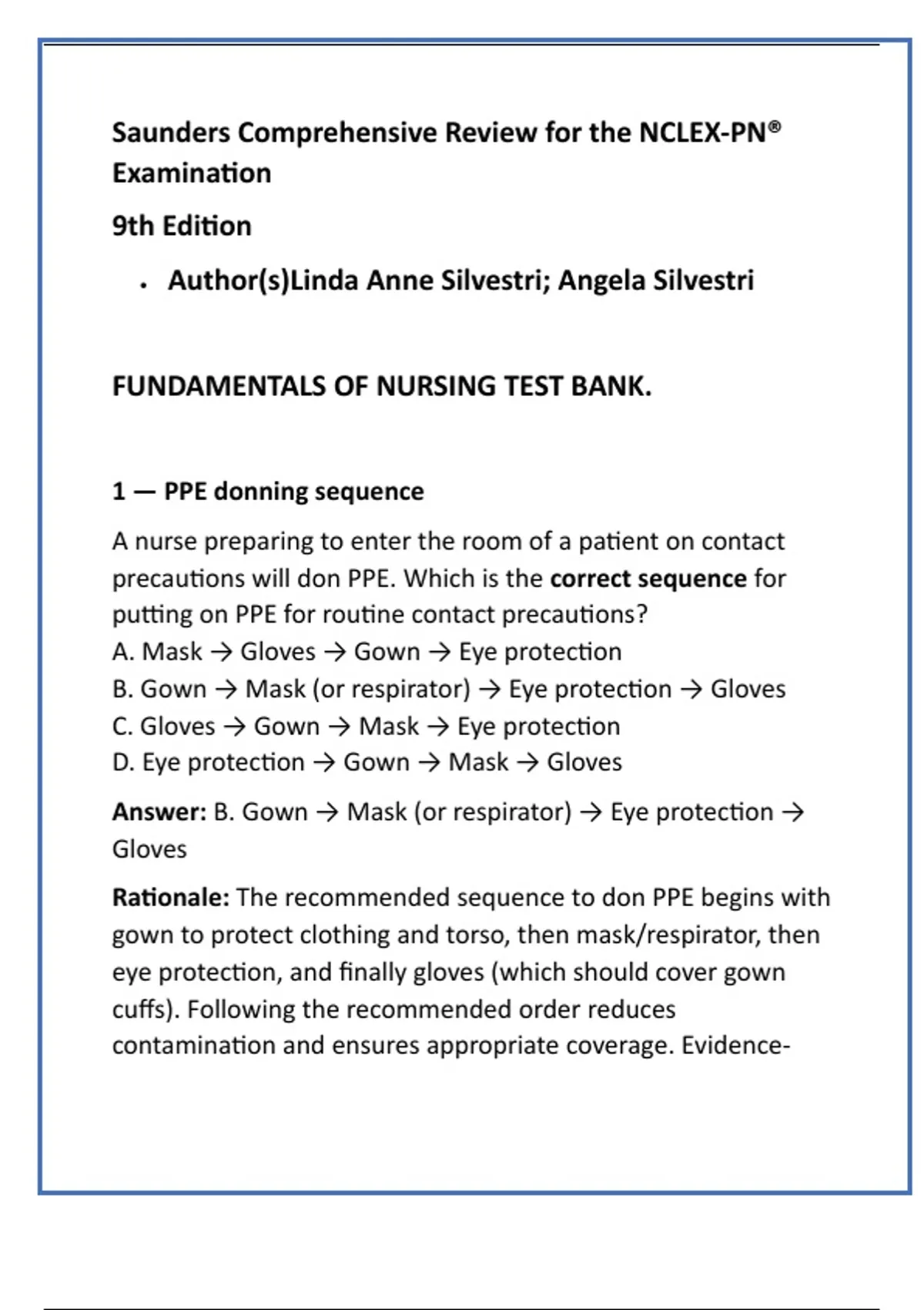 Rationale: The recommended sequence to don PPE begins with