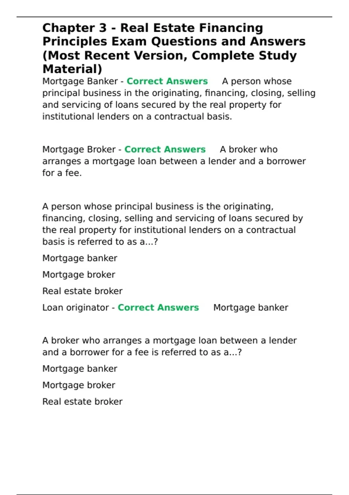 Summary Chapter 3 - Real Estate Financing Principles Exam Questions and Answers (Most Recent Version,