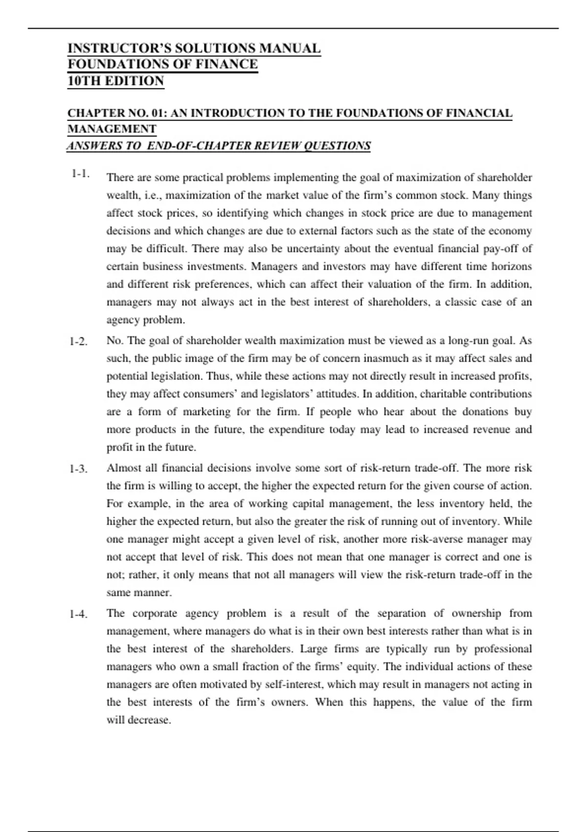 1-4. The corporate agency problem is a result of the separation of ownership from