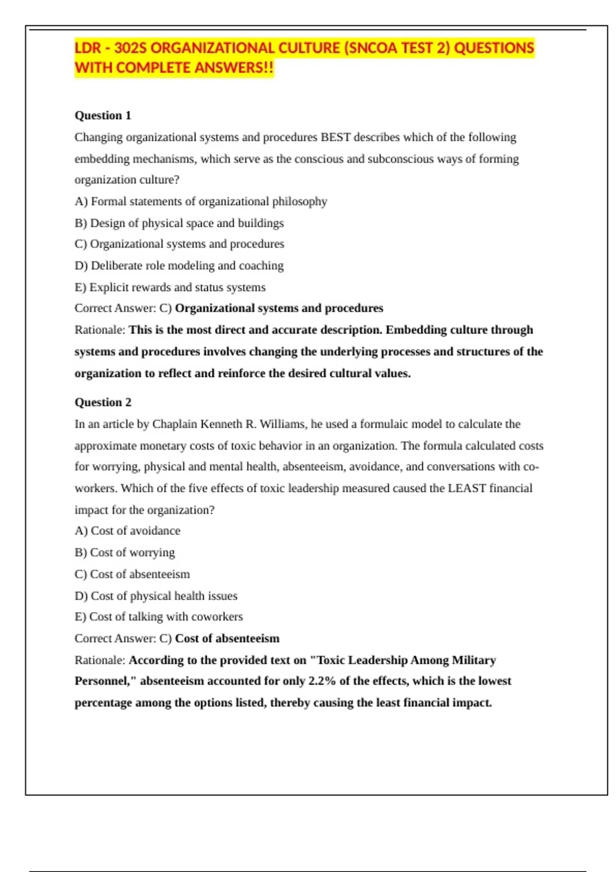 LDR - 302S ORGANIZATIONAL CULTURE (SNCOA TEST 2) QUESTIONS WITH COMPLETE ANSWERS!!