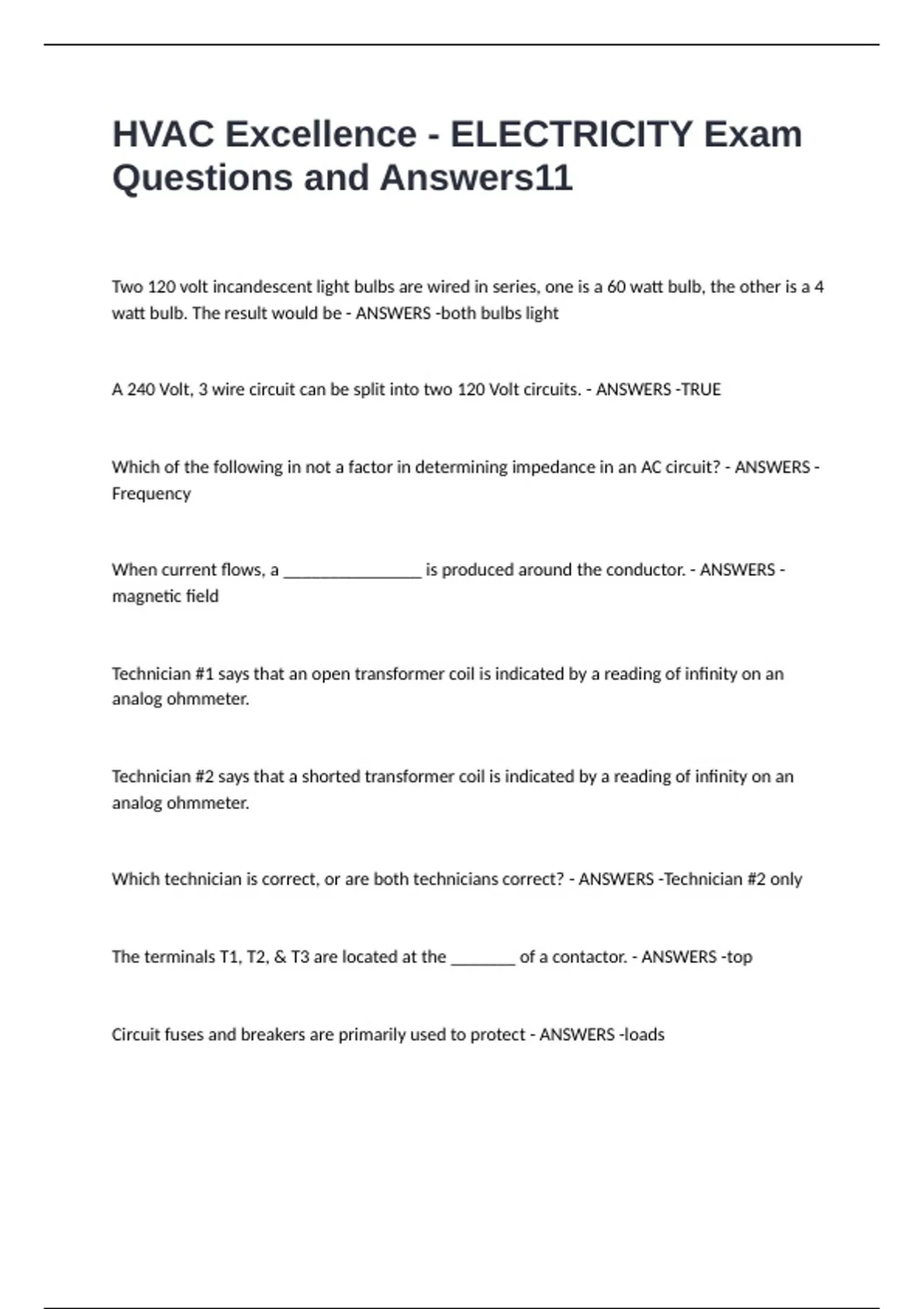 HVAC Excellence - ELECTRICITY Exam Questions and Answers Two 120 volt incandescent light bulbs are wired in series, one is a 60 watt bulb, the other is a 4 watt bulb. The result would be - ANSWERS -both bulbs light A 240 Volt, 3 wire circuit can be split into two 120 Volt circuits. - ANSWERS -TRUE Which of the following in not a factor in determining impedance in an AC circuit? - ANSWERS -Frequency When current flows, a _______________ is produced around the conductor. - ANSWERS -magnetic field Technician #1 says that an open transformer coil is indicated by a reading of infinity on an analog ohmmeter. Technician #2 says that a shorted transformer coil is indicated by a reading of infinity on an analog ohmmeter. Which technician is correct, or are both technicians correct? - ANSWERS -Technician #2 only The terminals T1, T2, & T3 are located at the _______ of a contactor. - ANSWERS -top Circuit fuses and breakers are primarily used to protect - ANSWERS -loads