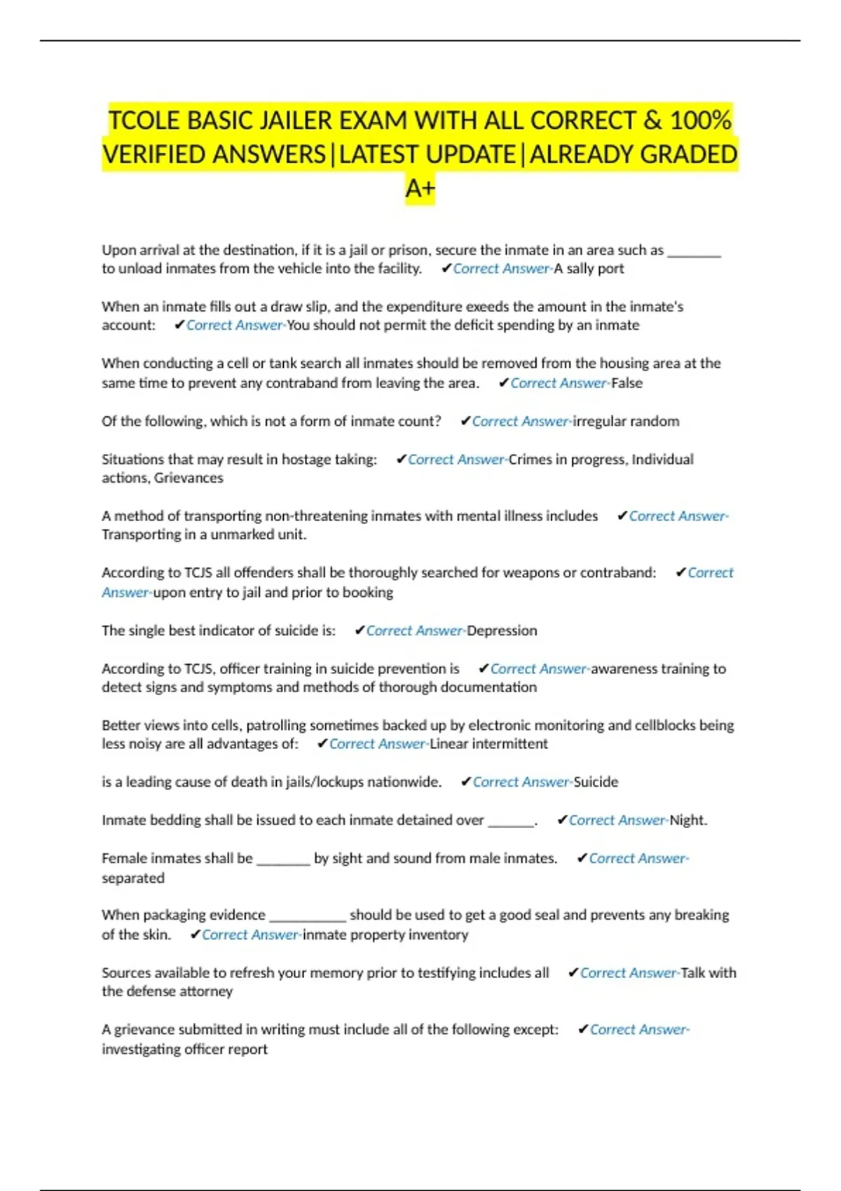 is a leading cause of death in jails/lockups nationwide. ✔Correct Answer-Suicide