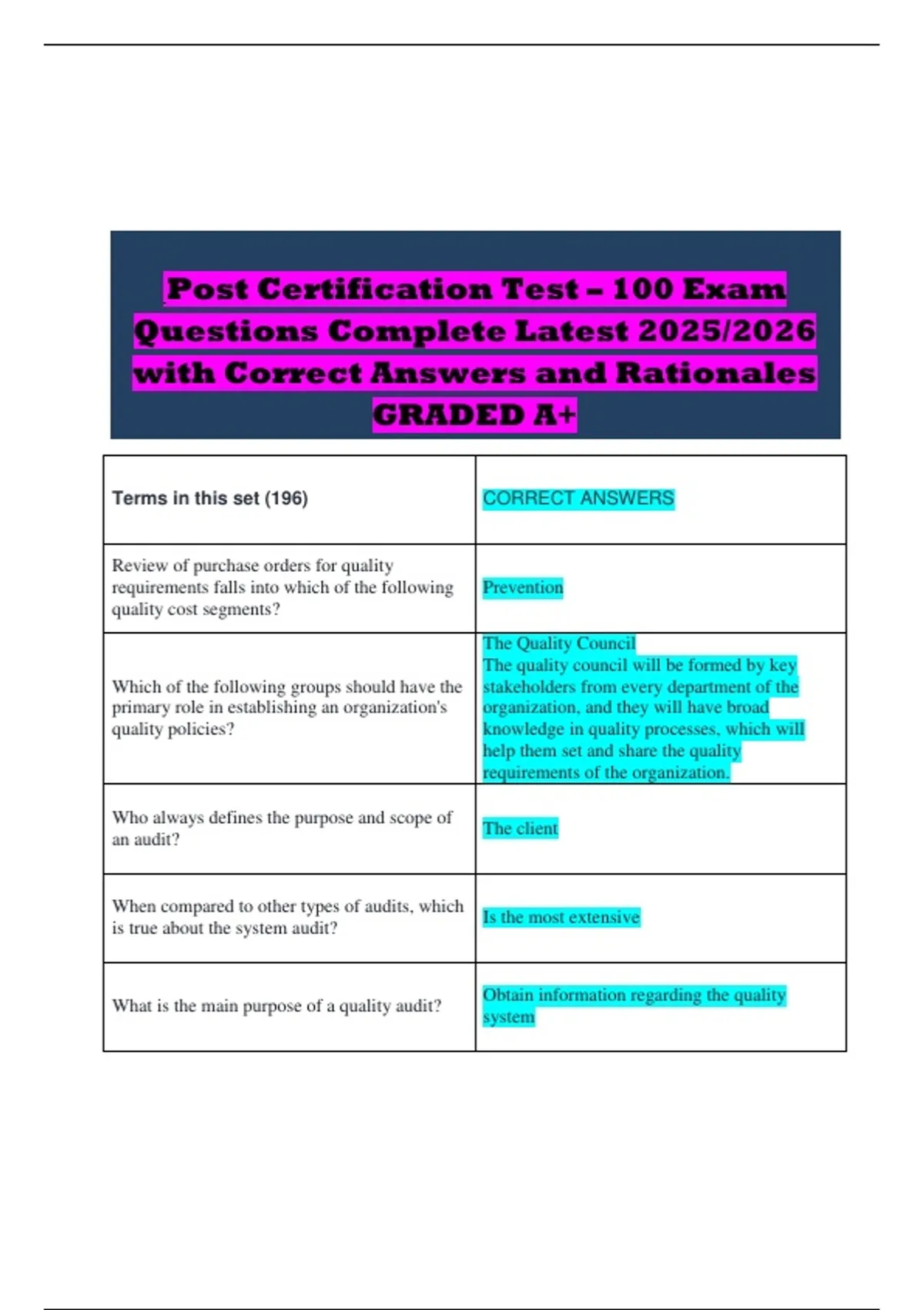 Post Certification Test – 100 Exam Questions Complete Latest 2025/2026 with Correct Answers and Rationales GRADED A+