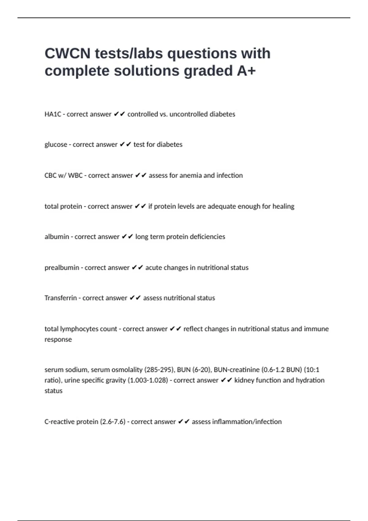 HA1C - correct answer ✔✔ controlled vs. uncontrolled diabetes