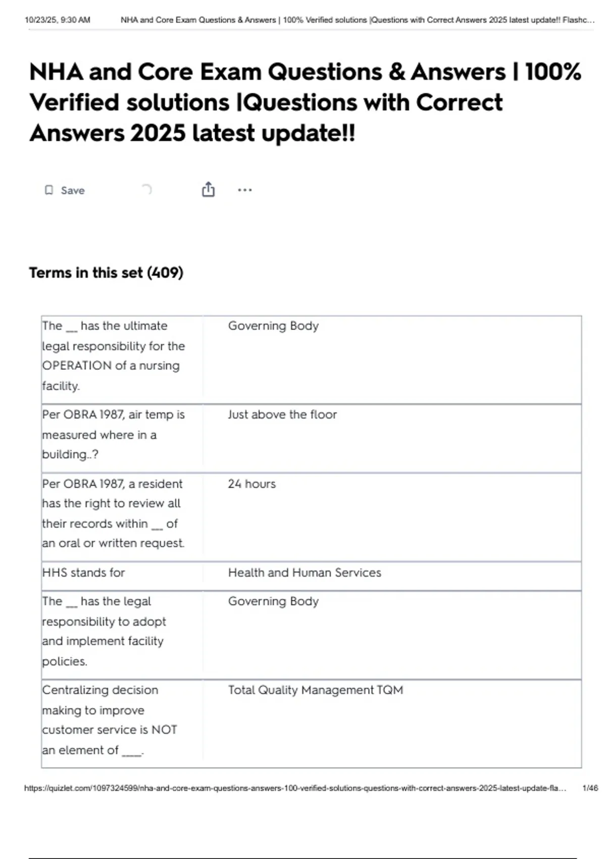 10/23/25, 9:30 AM NHA and Core Exam Questions & Answers | 100% Verified solutions |Questions with Correct Answers 2025 latest update!! Flashc…