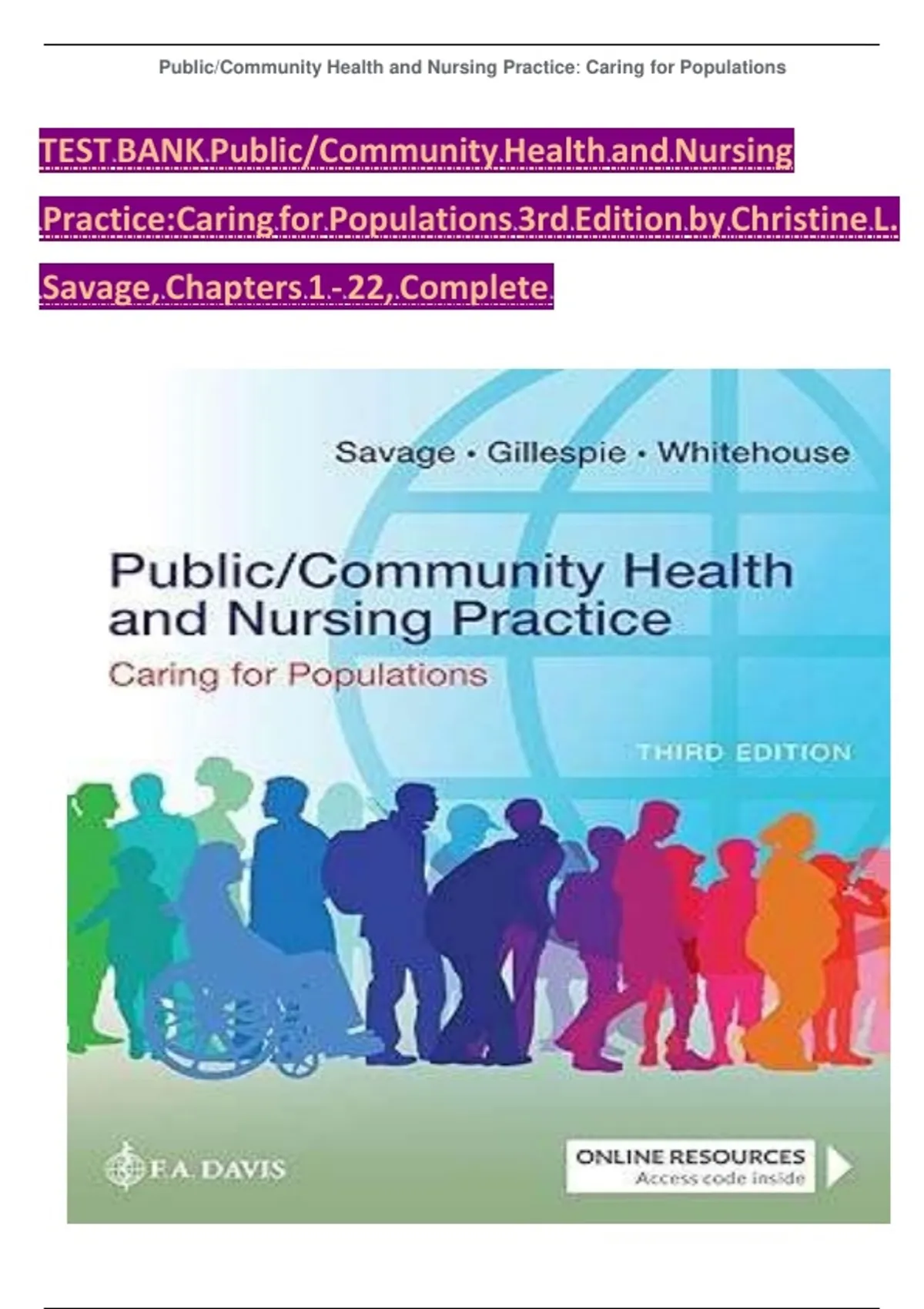 TEST BANK For Public / Community Health and Nursing Practice: Caring for Populations, 3rd Edition, Christine L. Savage, Verified Chapters 1 - 22, Complete Newest Version