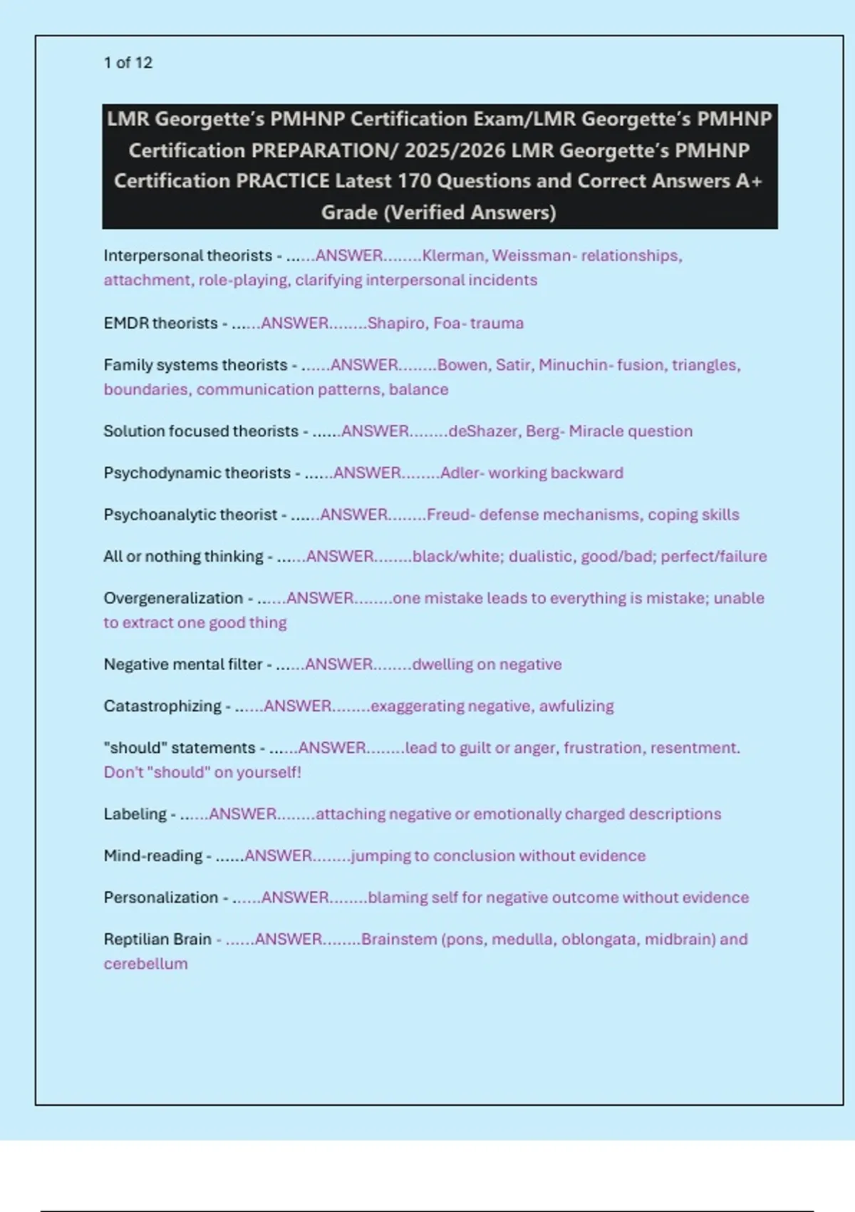 8Master your PMHNP certification exam with this comprehensive 170-question practice guide. This resource provides verified answers and covers all critical domains, including: Neuroanatomy & Neurotransmitters: Detailed breakdown of brain structures (limbic system, dopamine pathways, cerebral cortex) and their clinical correlations to psychiatric conditions. Psychopharmacology: Essential knowledge on psychotropic medications (SSRIs, SNRIs, NDRIs, SGAs), their mechanisms, side effects, and therapeutic drug monitoring (e.g., Lithium, Clozapine). Psychiatric Assessment & Diagnostics: Key concepts in lab interpretation (LFTs, ANC), cardiac murmurs, and evidence-based practice hierarchies. Psychological Theories & Therapies: Foundational theories from Freud, Beck, Bowen, and others, covering Psychodynamic, CBT, Family Systems, and more. Clinical Concepts: Defense mechanisms, cognitive distortions, cultural idioms of distress, and nursing ethics (HIPAA). Ideal for PMHNP students and candidates preparing for the ANCC or AANP board exams in 2025 and 2026. Achieve an A+ grade with this targeted, high-yield review tool.