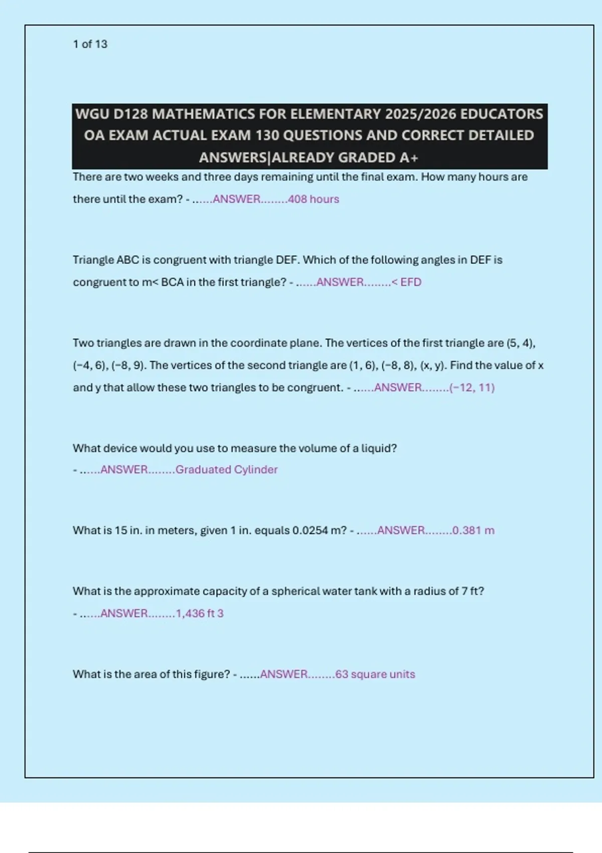 WGU D128 MATHEMATICS FOR ELEMENTARY 2025/2026 EDUCATORS