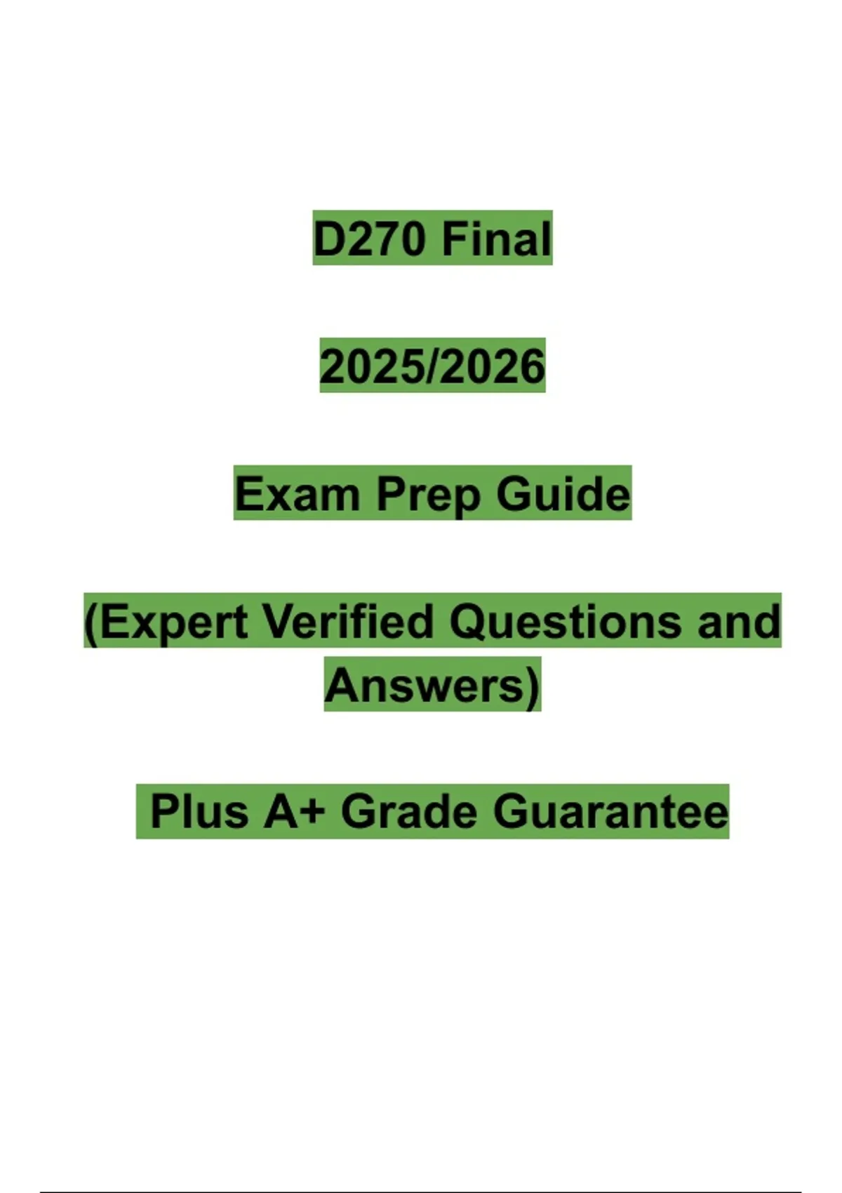 Prepare for your WGU D270 Final Exam (2025/2026) with this complete exam prep guide featuring verified questions, accurate answers, and concise study notes. Built around Western Governors University’s latest course outline, this resource helps you review efficiently, strengthen key concepts, and achieve top results on your final assessment.