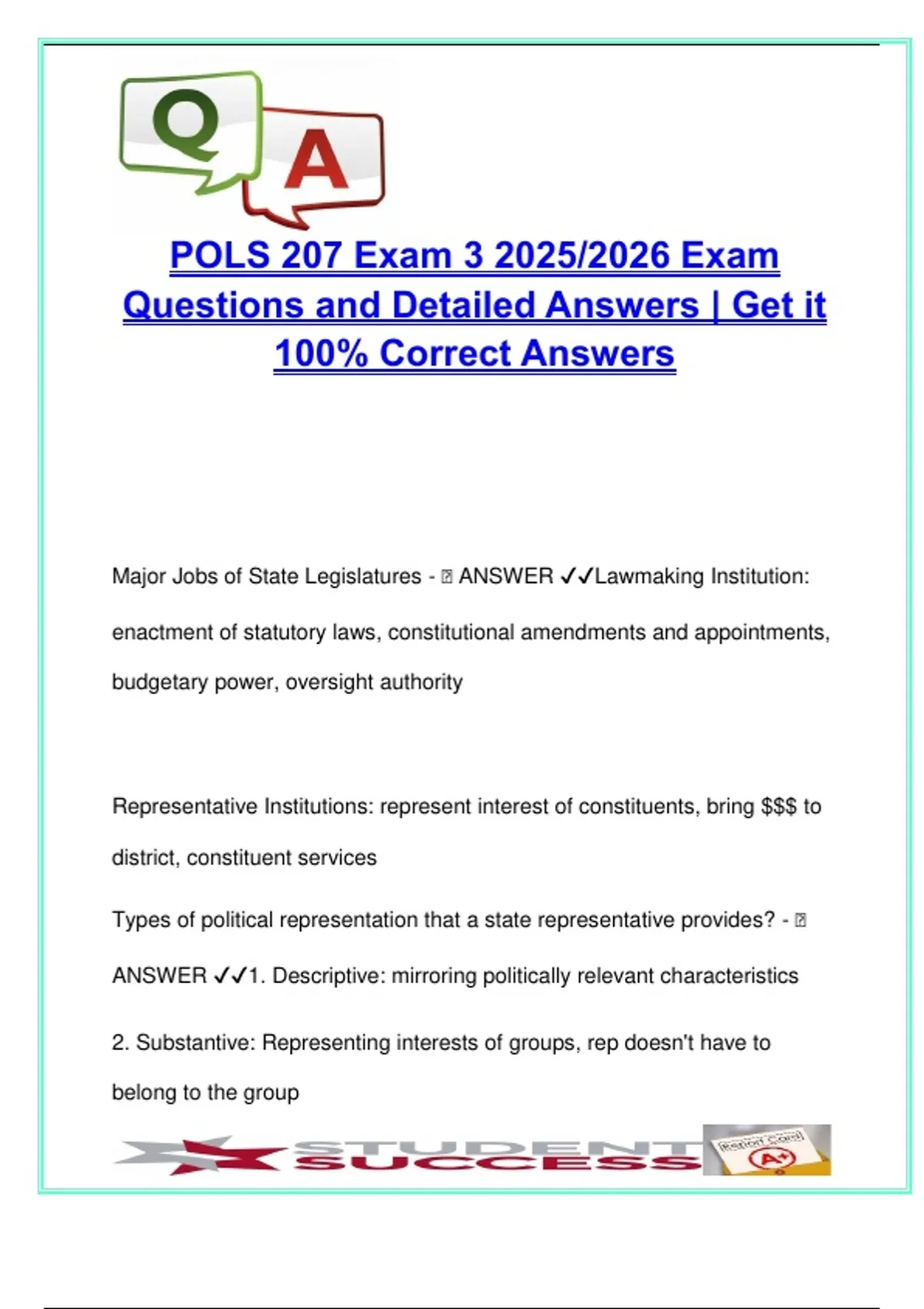Major Jobs of State Legislatures - 🧠 ANSWER ✔✔Lawmaking Institution: