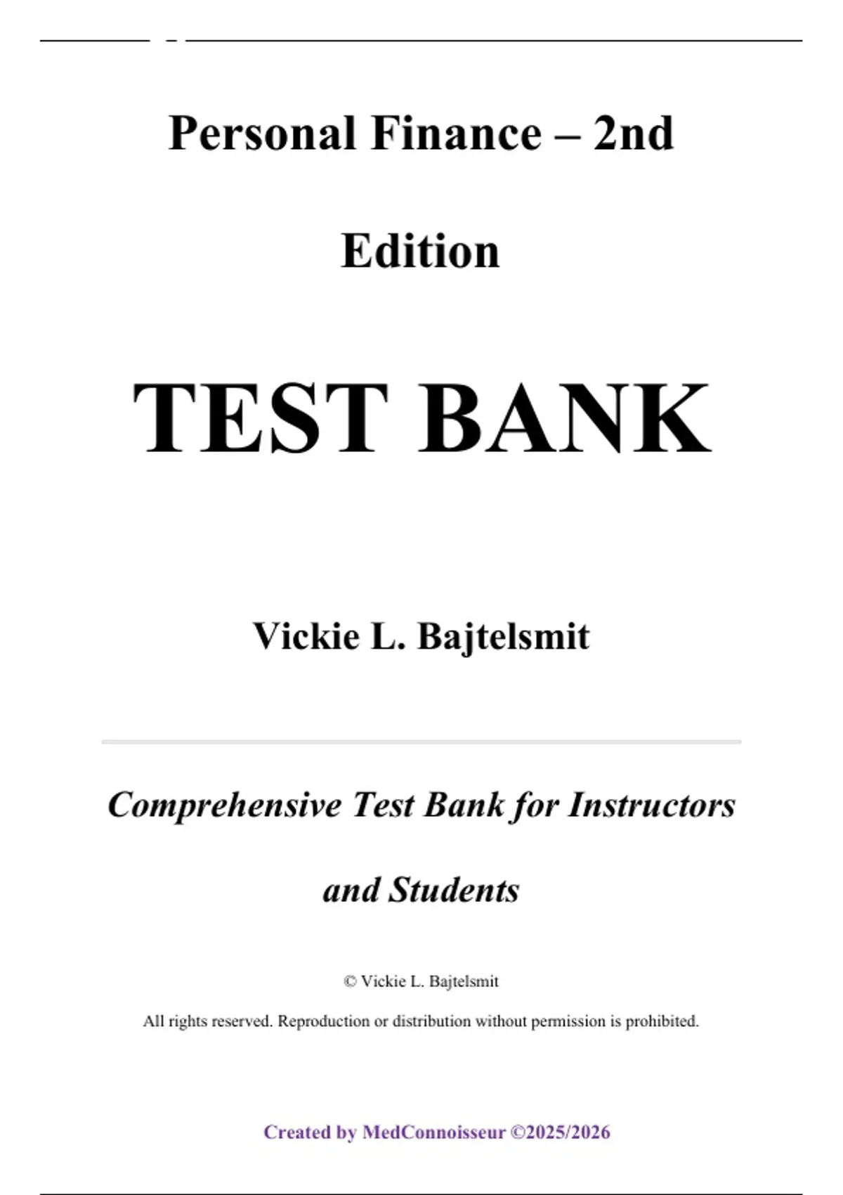 The Test Bank for Personal Finance, 2nd Edition by Vickie L. Bajtelsmit is a comprehensive, instructor‑aligned collection of assessment materials designed to mirror the textbook’s real‑world, decision‑making orientation. This resource includes multiple‑choice, true/false, short‑answer, and scenario‑based questions, each mapped to chapter learning outcomes and aimed at reinforcing students’ competence in personal financial planning. The question sets fully cover the textbook’s 14 chapters: Chapter 1: The Financial Planning Process, Chapter 2: Financial Planning Tools: Personal Financial Statements and the Time Value of Money, Chapter 3: Budgeting and Cash Management, Chapter 4: Tax Planning, Chapter 5: Managing Consumer Credit: Credit Cards and Consumer Loans, Chapter 6: Making Automobile and Housing Decisions, Chapter 7: Insuring Cars and Homes, Chapter 8: Life Insurance and Long‑Term Care Planning, Chapter 9: Employee Benefits: Health, Disability, and Retirement Plans, Chapter 10: Savings for Distant Goals: Retirement and Education Funding, Chapter 11: The Fundamentals of Investing, Chapter 12: Investing in Stocks and Bonds, Chapter 13: Investing in Mutual Funds and Real Estate, and Chapter 14: Estate Planning