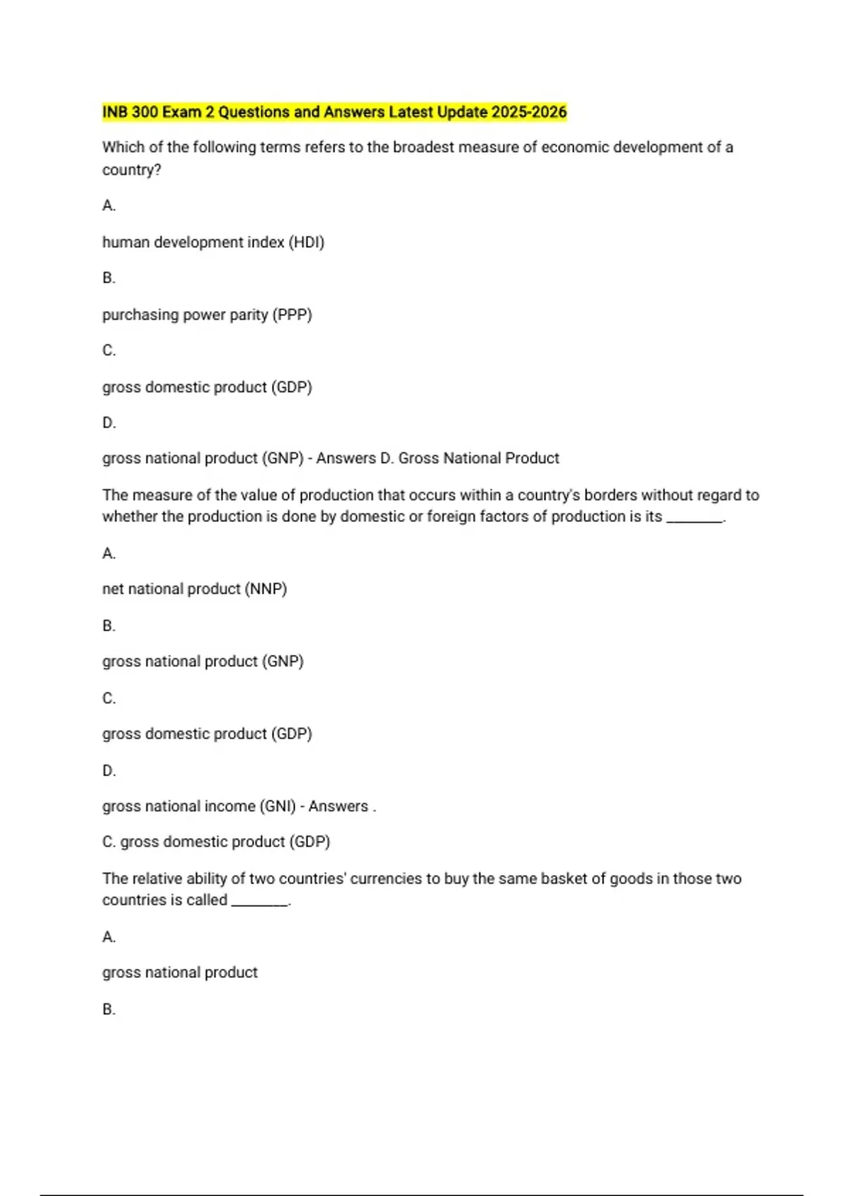 INB 300 Exam 2 Questions and Answers Latest Update Which of the following terms refers to the broadest measure of economic development of a country? A. human development index (HDI) B. purchasing power parity (PPP) C. gross domestic product (GDP) D. gross national product (GNP) - Answers D. Gross National Product The measure of the value of production that occurs within a country's borders without regard to whether the production is done by domestic or foreign factors of production is its ________. A. net national product (NNP) B. gross national product (GNP) C. gross domestic product (GDP) D. gross national income (GNI) - Answers . C. gross domestic product (GDP) The relative ability of two countries' currencies to buy the same basket of goods in those two countries is called ________. A. gross national product B. purchasing power C. purchasing power parity D. gross domestic product - Answers C. purchasing power parity ________ is the value of goods and services that can be purchased with one unit of a country's currency. A. Gross domestic product B. Gross national product C. Potential output D. Purchasing power - Answers D. Purchasing power Which of the following terms is used to refer to the exchange of goods and services for other goods and services instead of money? A. barter B. fiat money C. guanxi D. letter of credit - Answers A. barter The GDP per capita of a country is lower than that of France. If the GDP per capita of the country is adjusted for PPP, the country's revised GDP is higher than that of France. Which of the following is most likely true about the country? A. The cost of living in the country is lower than that of France. B. The cost of living in the country is approximately equal to that of France. C. The cost of living in the country is higher than that of France. D. The cost of living in the country has increased over the past decade. - Answers A. The cost of living in the country is lower than that of France. The GDP per capita of a country is higher than that of Thailand. If the GDP per capita of the country is adjusted for PPP, the country's revised GDP is lower than that of Thailand. Which of the following is most likely true about the country? A. There are fewer goods available for purchase in the country than in Thailand. B. It costs less to buy everyday goods in the country than in Thailand. C. The cost to buy everyday goods in the country is approximately the same as in Thailand.