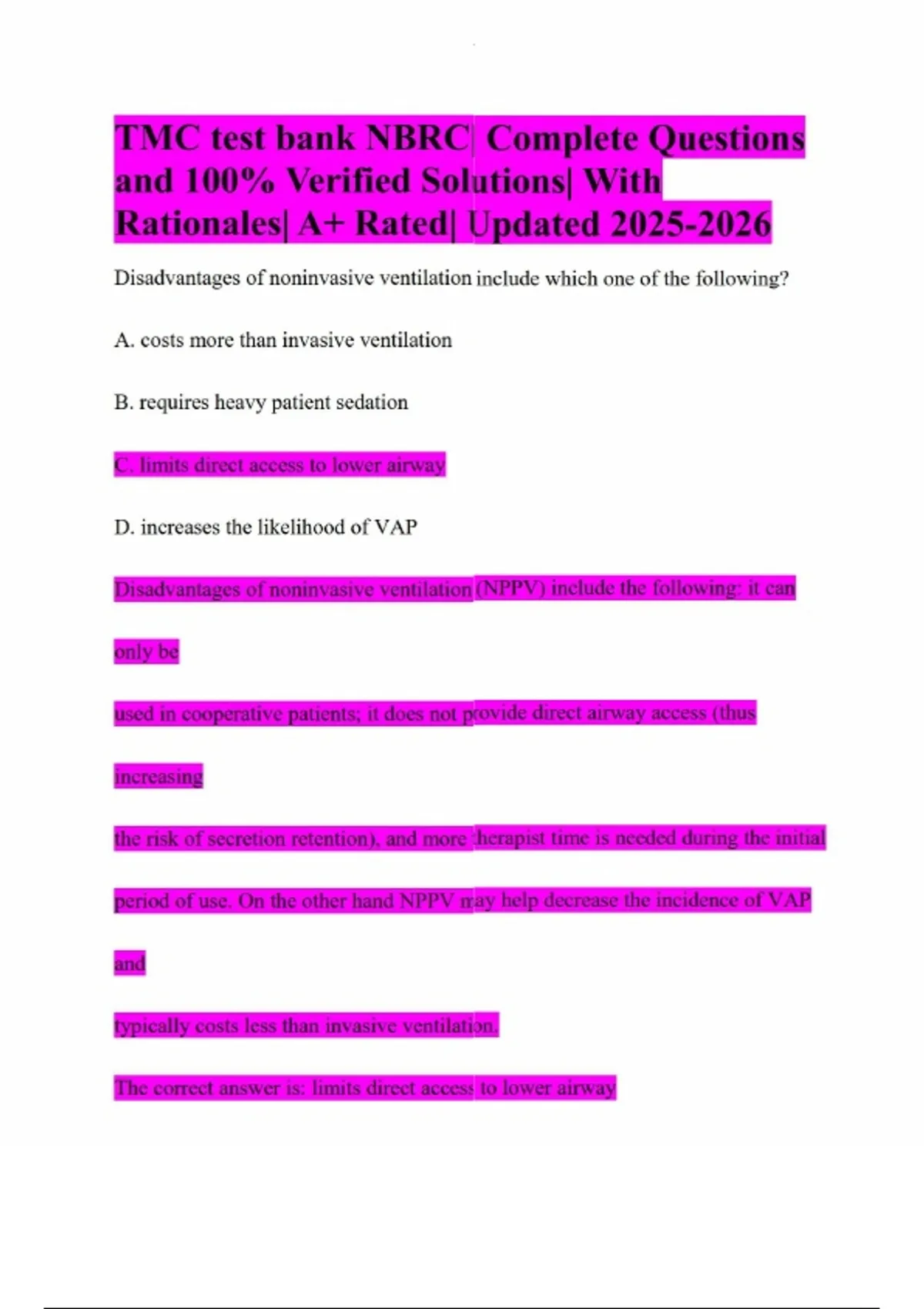 TMC test bank NBRC| Complete Questions and 100% Verified Solutions| With Rationales| A+ Rated| Updated Disadvantages of noninvasive ventilation include which one of the following? A. costs more than invasive ventilation B. requires heavy patient sedation C. limits direct access to lower airway D. increases the likelihood of VAP Disadvantages of noninvasive ventilation (NPPV) include the following: it can only be used in cooperative patients; it does not provide direct airway access (thus increasing the risk of secretion retention), and more therapist time is needed during the initial period of use. On the other hand NPPV may help decrease the incidence of VAP and typically costs less than invasive ventilation. The correct answer is: limits direct access to lower airway On a patient receiving volume control AC ventilation, you observe a flow-volume with a sawtooth pattern on exhalation. Which of the following actions would you consider most appropriate? A. recommend administering a bronchodilator B. assess the patient's need for suctioning C. measure the endotracheal tube cuff pressure D. switch to pressure control ventilation The flow-volume loop reveals irregular sawtooth- like oscillations, primarily in the expiratory portion of the loop. This indicates either 1) accumulation of airway secretions in the trachea/large airways (requiring suctioning), or 2) condensate partially blocking the expiratory limb of the ventilator circuit proximal to the expiratory flow sensor. Auscultation of rhonchi or tactile fremitus over the trachea would confirm excess secretions as the problem. The correct answer is: assess the patient's need for suctioning A 30 year-old male was found supine and unresponsive. In the ER it was confirmed he had aspirated while on his back. After the patient is transferred to ICU his physician orders postural drainage and percussion every 4 hours. What is the best position to place him in to drain the affected area? A. prone with a pillow under his hips B. prone with feet elevated 30 degrees C. supine with a pillow under his hips D. supine with feet elevated 30 degrees This patient aspirated while lying flat on his back. Most commonly, this affects the superior segments of both lower lobes. The position which facilitates drainage from this lung region is a prone position with a pillow under the patient's hips. The correct answer is: prone with a pillow under his hips You need to perform nasotracheal suctioning on a patient with retained secretions. As compared to suctioning via a tracheal airway, which of the following complications are unique to this procedure? A. hypotension B. gagging/aspiration C. hypoxemia D. increased ICP Complication/hazards common to both tracheobronchial and nasotracheal suctioning include hypoxemia, cardiac dysrhythmias, bradycardia, hyper-/hypotension, bronchospasm, atelectasis, increased intracranial pressure and the potential for contamination/infection. Unique complications of nasotracheal suctioning include nasal trauma/epistaxis, pharyngeal trauma, gagging (with potential 241 vomiting/aspiration), and laryngospasm. Also misdirection of the catheter is more common with nasotracheal suctioning. Which of the following indicates a deficit in fluid balance A. Pedal edema B. Poor skin turgor C. cap refill D. JVD Poor skin turgor ARDS patient, what should RT use to evaluate oxygen delivery for optimal PEEP A. ABG B. mixed venous C. serum lactate D. CO mixed venous RT performing a high calibration on a nitric oxide, expected value is A. 45 B. 10 C. 25 D. 80 45 To help prevent infection after an aerosol drug treatment provided via small volume nebulizer (SVN) you would: A. shake out any residual solution then bag the SVN B. rinse the SVN with tap water then dry and bag it C. run the SVN at high flows until completely dry D. rinse the SVN with sterile water then dry and bag it To minimize the likelihood of infection in patients receiving aerosol drug therapy via a small volume nebulizer (SVN), you should 1) use a different SVN for each patient, 2) change the SVN and tubing every 24 hours, and 3) perform thorough hand hygiene prior to each therapy session. It is also recommended that the nebulizer NOT be rinsed with tap water, but rather rinsed with sterile water and blown dry between uses. If rinsing with sterile water not feasible, rinse the device with filtered or tap water, then rinse with isopropyl alcohol and dry. The correct answer is: rinse the SVN with sterile water then dry and bag it A doctor orders aerosol drug therapy via small volume nebulizer for a patient receiving mechanical ventilation via a dual-limb breathing circuit. To prevent drug residue from affecting ventilator performance you must make sure that: A. both inspiratory and expiratory HEPA filters are in place B. a HEPA filter is in place on the inspiratory limb of the circuit C. a heat and moisture exchanger is in place at the patient connector D. a HEPA filter is in place on the expiratory limb of the circuit HEPA filters are needed to prevent drug residue from entering the ventilator and affecting its performance. For dual-limb circuits, be sure that inspiratory and expiratory HEPA filters are in place. For single-limb circuits, you normally only need an inspiratory HEPA filter; expiratory filtration may be required on patients with disorders requiring droplet or respiratory precautions. The correct answer is: both inspiratory and expiratory HEPA filters are in place Your patient is receiving aerosolized bronchodilators to treat her asthma. What is the best way to determine whether this treatment is achieving the desired goal? A. measure the patient's MIP before-and-after treatment