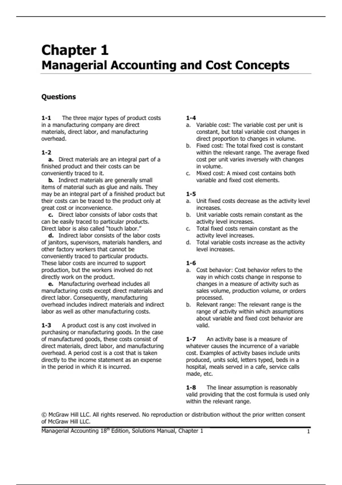 Managerial Accounting 18th Edition, Solutions Manual, Chapter 1 1