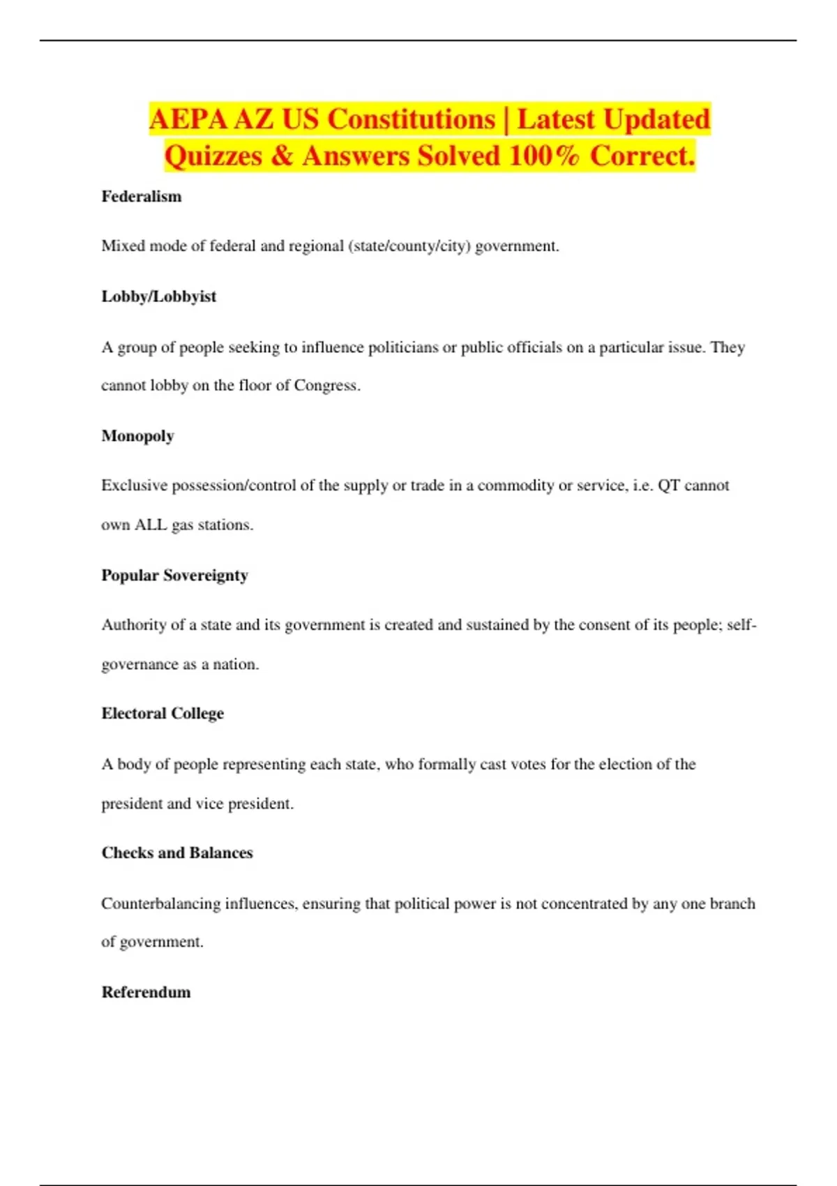 AEPA AZ US Constitutions | Latest Updated Quizzes & Answers Solved 100% Correct