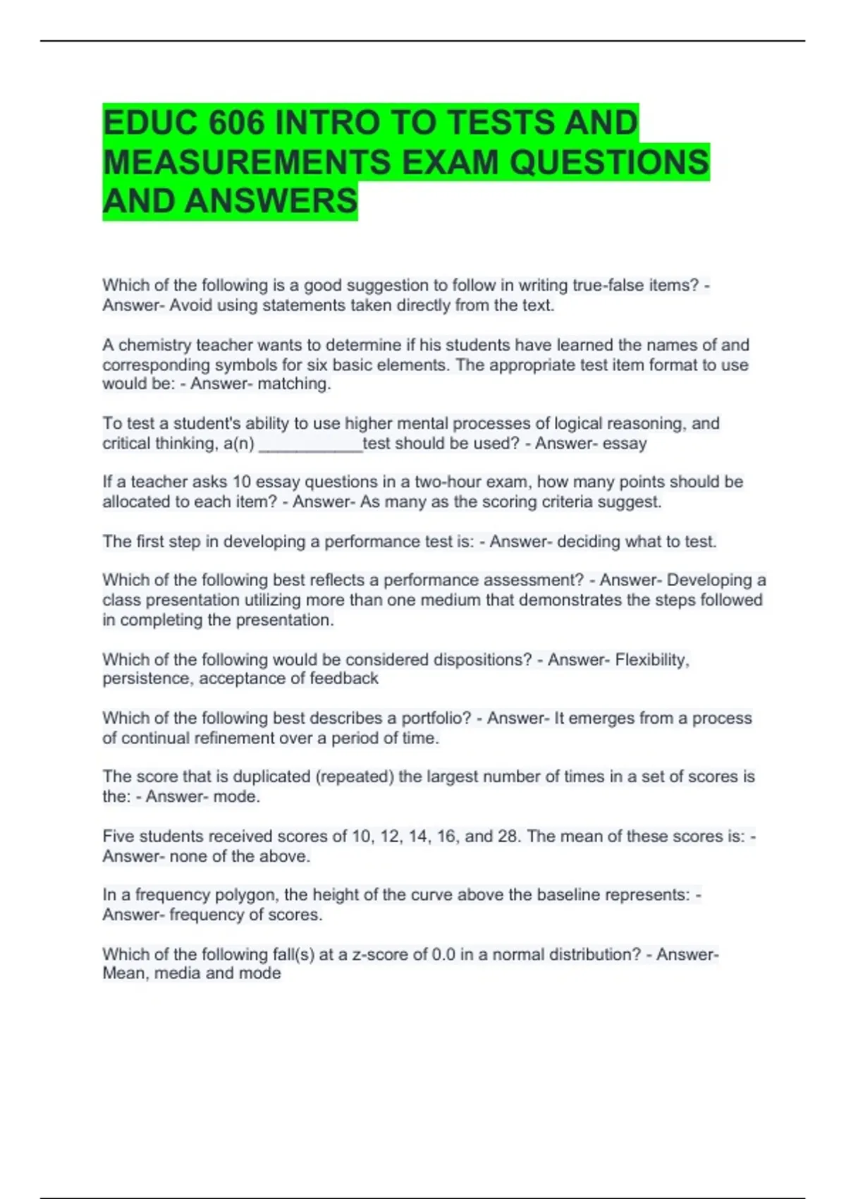 EDUC 606 INTRO TO TESTS AND MEASUREMENTS EXAM QUESTIONS AND ANSWERS