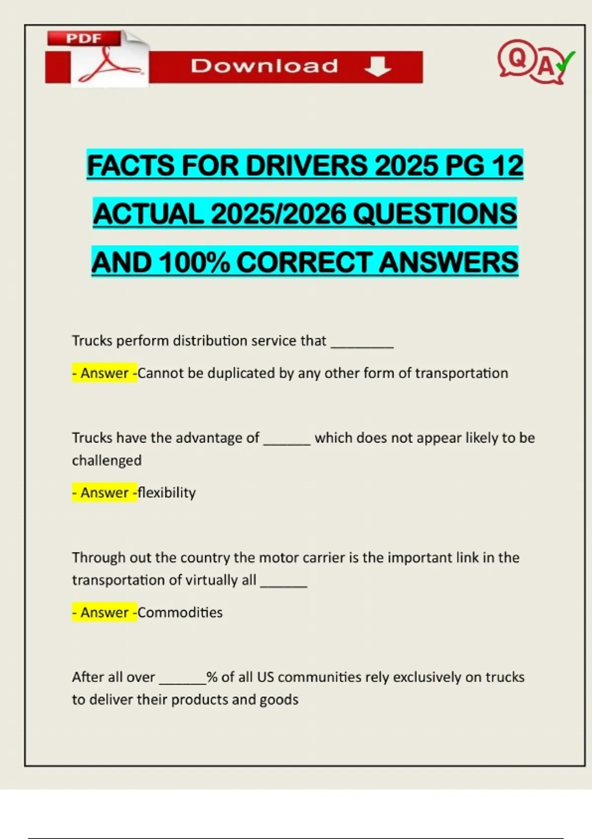 FACTS FOR DRIVERS 2025 PG 12 ACTUAL 2025/2026 QUESTIONS AND 100% CORRECT ANSWERS Trucks perform distribution service that ________ - Answer -Cannot be duplicated by any other form of transportation Trucks have the advantage of ______ which does not appear likely to be challenged - Answer -flexibility Through out the country the motor carrier is the important link in the transportation of virtually all ______ - Answer -Commodities After all over ______% of all US communities rely exclusively on trucks to deliver their products and goodsNeed assistance on Online classes, Exams & Assignments? Reach out for instant help!! Full Course Assistance, Plagiarism-free Essay Writing, Research Paper, Dissertation, Discussion Posts, etc…. Confidential & Secure services. Tutors are available for all subjects! Email now at: - Answer -80% The motor truck is the only ______ _______of transport to many warehouses , stores , ams comsumers doors - Answer -Direct means