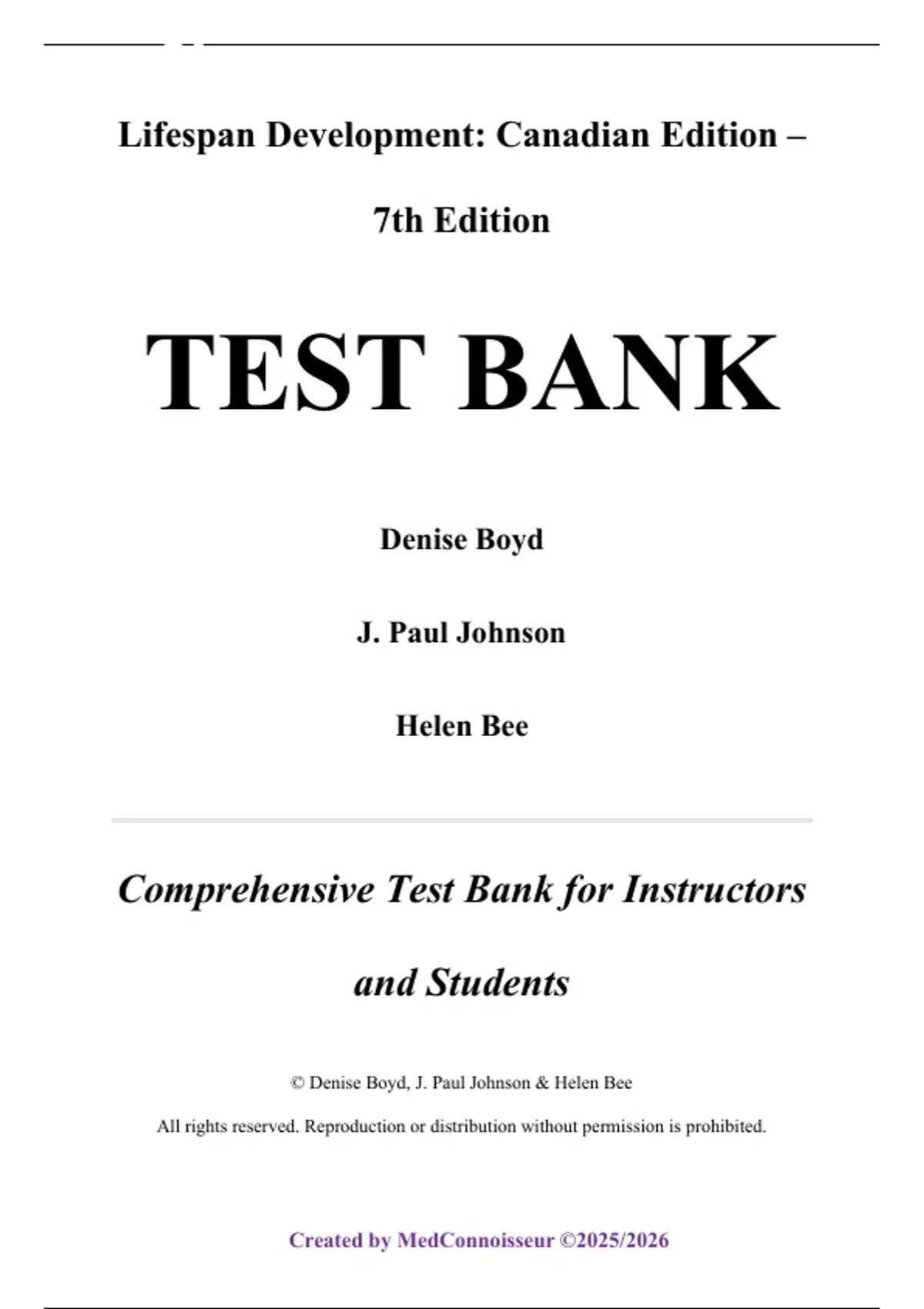 The Test Bank for Lifespan Development, Canadian Edition, 7th Edition by Denise Boyd, Paul Johnson, and Helen Bee offers a fully aligned, instructor‑verified collection of assessment items that span the complete chronological scope of human development. This resource includes multiple‑choice, true/false, short‑answer, and case‑based questions mapped to each chapter’s learning objectives, integrating both theoretical and applied perspectives. It begins with Chapter 1: Basic Concepts and Methods and Chapter 2: Theories of Development, then moves through prenatal development (Chapter 3), and infancy covering physical, sensory, perceptual, cognitive, and social/personality dimensions (Chapters 4, 5, and 6). Early childhood physical and cognitive development and social/personality changes are explored in Chapters 7 and 8, followed by middle childhood in Chapters 9 and 10. Adolescent chapters include Chapter 11: Physical and Cognitive Development in Adolescence and Chapter 12: Social and Personality Development in Adolescence. Adult development topics span Chapters 13 and 14 (early adulthood), Chapters 15 and 16 (middle adulthood), and Chapters 17 and 18 (late adulthood). The final chapter is Chapter 19: Death, Dying, and Bereavement. This test bank serves as a robust tool for designing quizzes, midterms, finals, and supplementary assessments in lifespan development courses.
