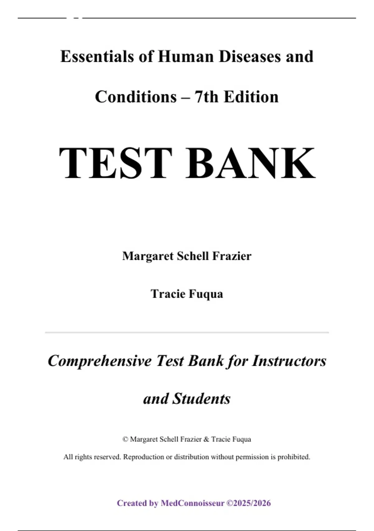 The Test Bank for Essentials of Human Diseases and Conditions, 7th Edition by Margaret Schell Frazier and Tracie Fuqua provides an extensive, instructor‑verified set of assessment items that correspond to the textbook’s system‑based organization and learning outcomes. Containing multiple‑choice, true/false, short answer, and clinical scenario questions, this resource is designed to assess student mastery of disease etiology, pathophysiology, diagnosis, and treatment across major body systems. The question sets cover all core chapters, beginning with Chapter 1: Mechanisms of Disease, Diagnosis, and Treatment, followed by Developmental, Congenital, and Childhood Diseases and Disorders, then Immunologic Diseases and Conditions, Diseases and Conditions of the Endocrine System, Eye and Ear, Integumentary System, Musculoskeletal System, Digestive System, Respiratory System, Circulatory System, Urinary System, Reproductive System, Neurologic Diseases and Conditions, Mental Disorders, and Disorders and Conditions Resulting from Trauma, with additional material aligned to appendices on common lab and diagnostic tests and pharmacology. This test bank supports quizzes, midterms, and finals with questions mapped to chapter concepts, clinical application, and critical thinking around emerging issues such as opioid crisis and cancer treatment.