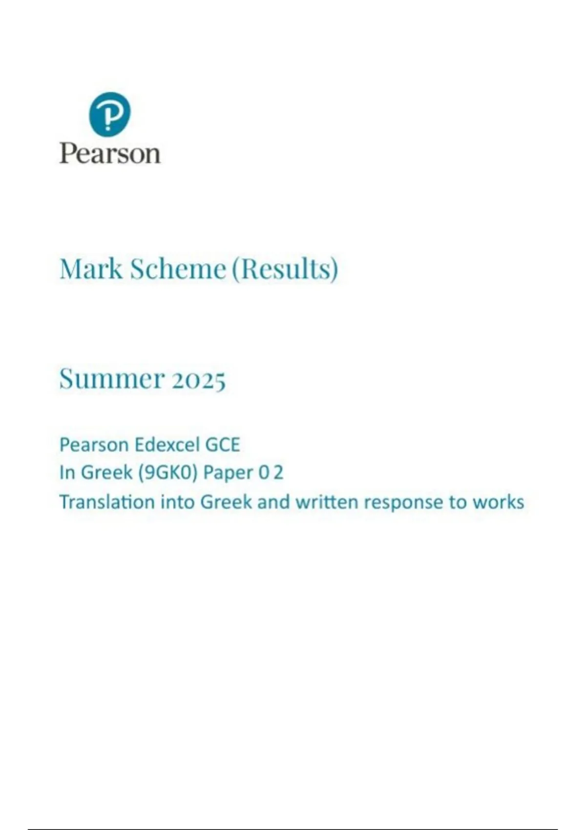 Pearson Edexcel a level Greek |final mark scheme |2025|9GK0/02|