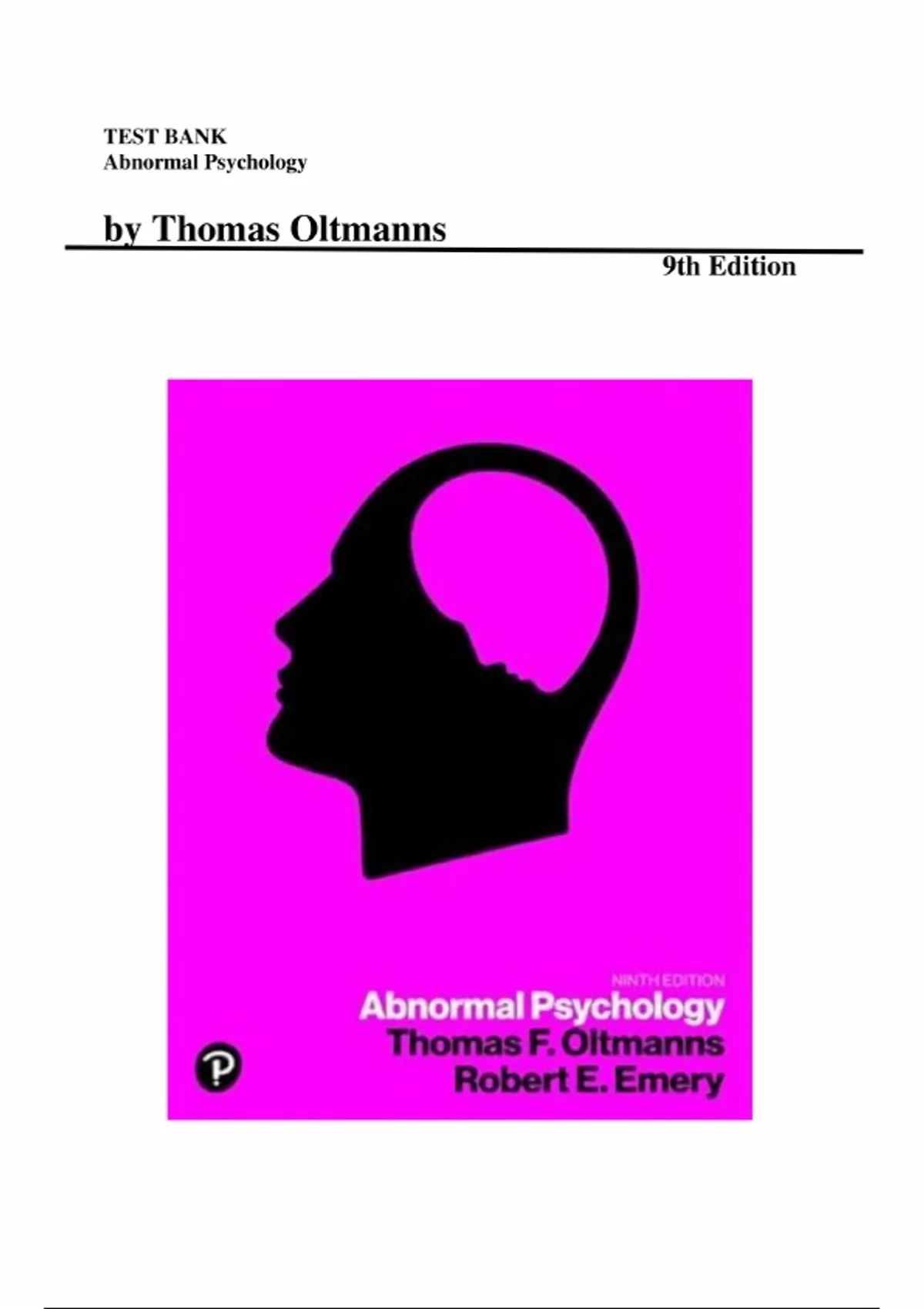 Abnormal Psychology (9th Edition, Thomas Oltmanns) | Complete Test Bank with Exam Questions and Answers |1. Examples and Definitions of Abnormal Behavior, 2. Causes of Abnormal Behavior, 3. Treatment of Psychological Disorders, 4. Classification and Assessment of Abnormal Behavior, 5. Mood Disorders and Suicide, 6. Anxiety Disorders and Obsessive-Compulsive Disorder, 7. Acute and Post-traumatic Stress Disorders, Dissociative Disorders, and Somatic Symptom Disorders, 8. Stress and Physical Health, 9. Personality Disorders, 10. Feeding and Eating Disorders, 11. Substance-Related and Addictive Disorders, 12. Sexual Dysfunctions, Paraphilic Disorders, and Gender Dysphoria, 13. Schizophrenia Spectrum and Other Psychotic Disorders, 14. Neurocognitive Disorders, 15. Intellectual Disabilities and Autism Spectrum Disorders, 16. Psychological Disorders of Childhood, 17. Adjustment Disorders and Life-Cycle Transitions, 18. Mental Health and The Law