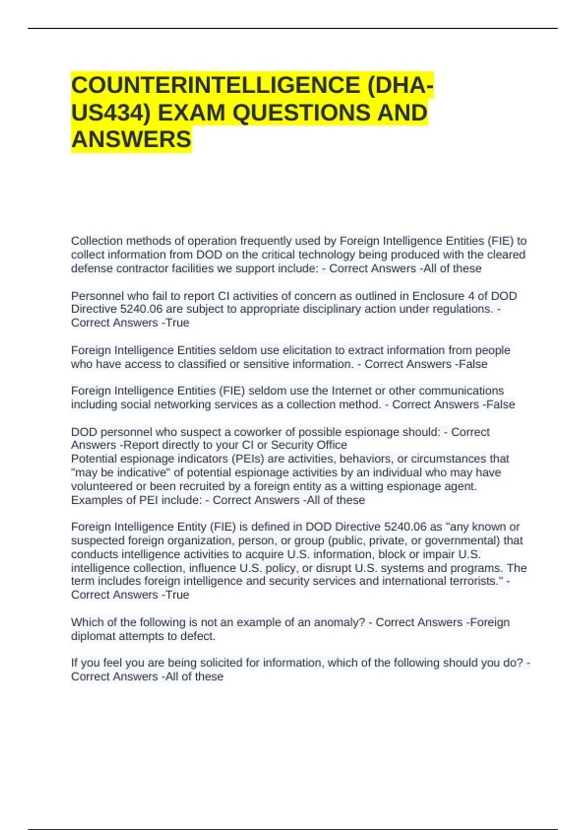 COUNTERINTELLIGENCE (DHA-US434) EXAM QUESTIONS AND ANSWERS