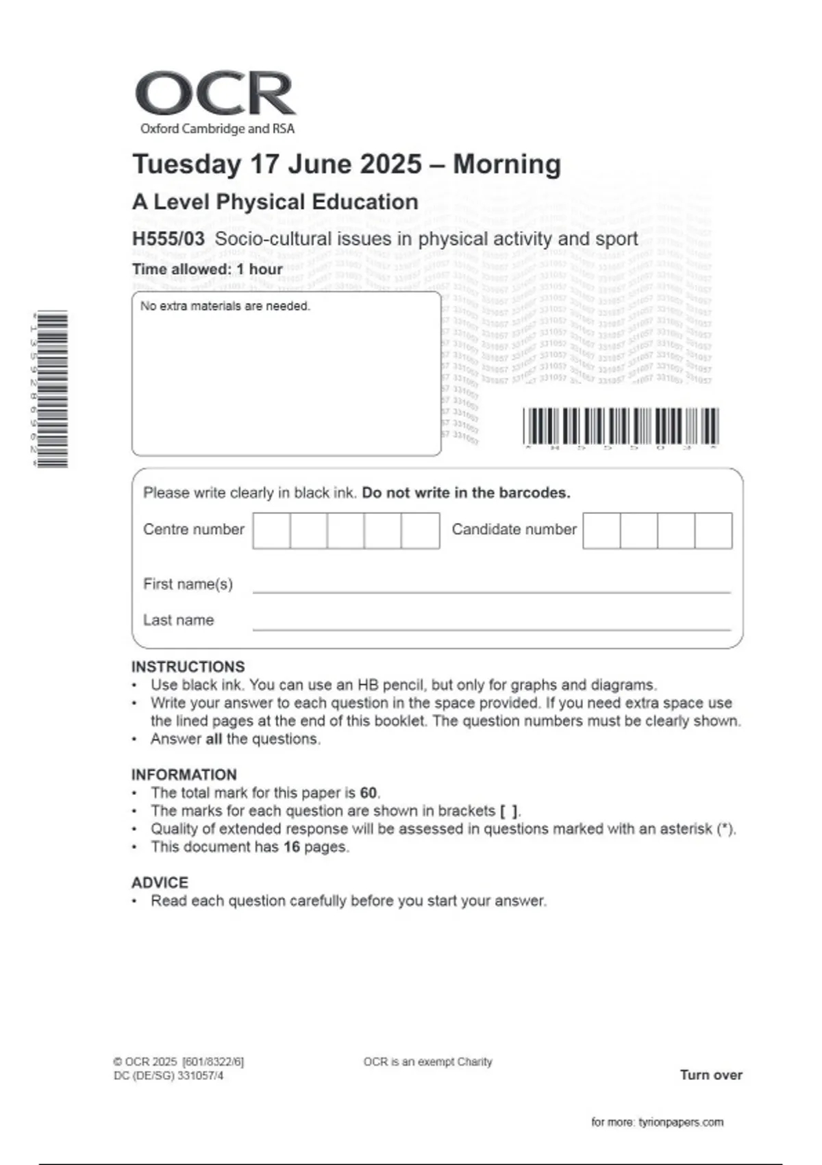OCR A LEVEL Physical Education H555/03 JUNE 2025 QUESTION PAPER: Socio-cultural issues in physical activity and sport