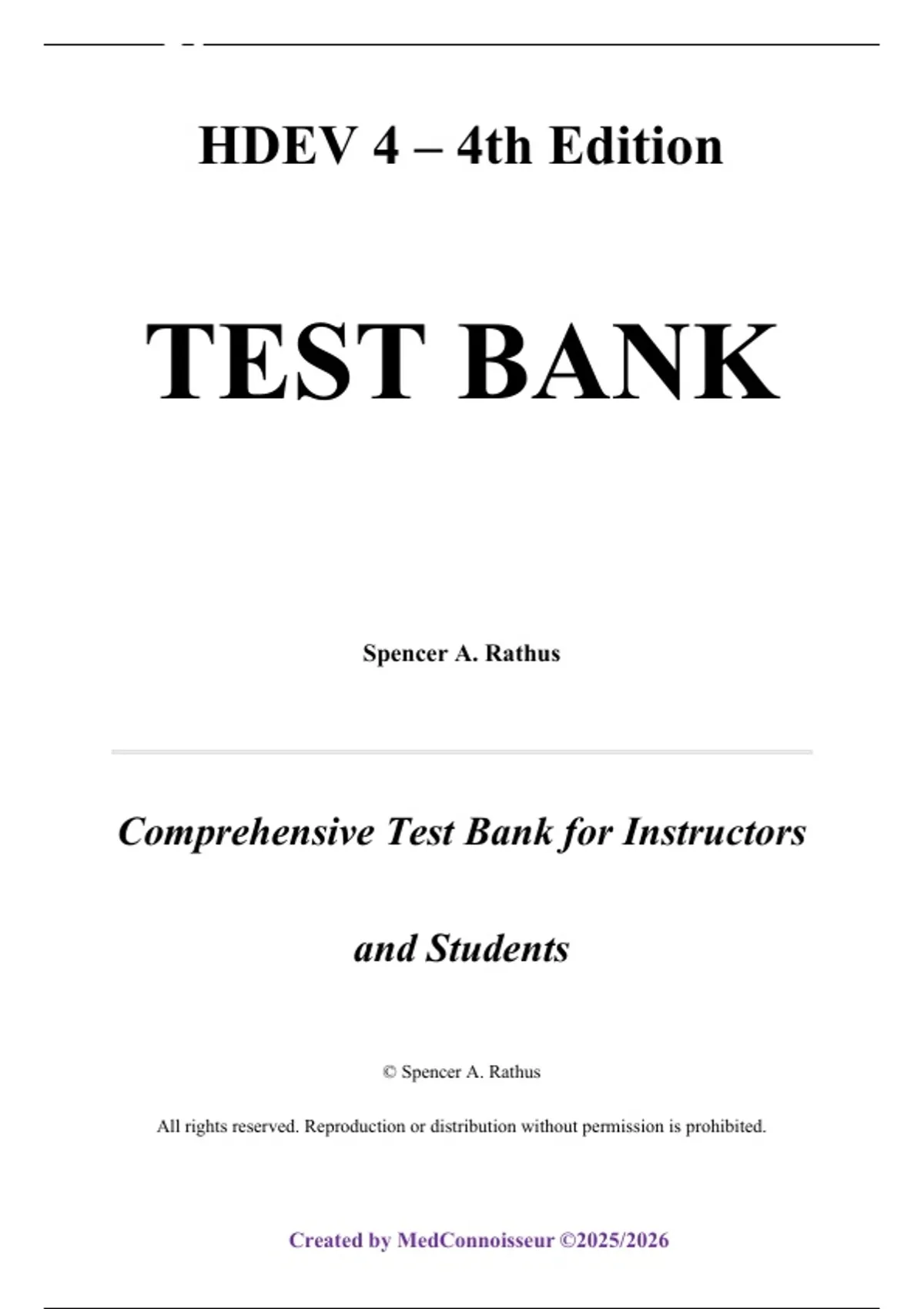 The Test Bank for HDEV, 4th Edition by Spencer Rathus, Rebecca Rogerson, and Laura Berk offers a complete, instructor‑aligned suite of assessment items covering every chapter in the textbook. This resource includes multiple‑choice, true/false, short‑answer, essay, and developmentally focused scenario questions mapped to chapter learning objectives and Bloom’s taxonomy. It is designed for lifespan development, psychology, and human development courses, providing tools to assess knowledge of theories, growth stages, social-emotional development, cognition, aging, and death. The chapters begin with Part One: Introduction, including Chapter 1: History, Theories, and Methods, and Chapter 2: Heredity and Prenatal Development. Part Two: Birth and Infancy includes Chapter 3: Birth and the Newborn Baby: In the New World; Chapter 4: Infancy: Physical Development; Chapter 5: Infancy: Cognitive Development; and Chapter 6: Infancy: Social and Emotional Development. Part Three: Early and Middle Childhood covers Chapter 7: Early Childhood: Physical and Cognitive Development; Chapter 8: Early Childhood: Social and Emotional Development; Chapter 9: Middle Childhood: Physical and Cognitive Development; and Chapter 10: Middle Childhood: Social and Emotional Development. Part Four: Adolescence and Early Adulthood is made up of Chapter 11: Adolescence: Physical and Cognitive Development; Chapter 12: Adolescence: Social and Emotional Development; Chapter 13: Early Adulthood: Physical and Cognitive Development; and Chapter 14: Early Adulthood: Social and Emotional Development. Part Five: Middle and Late Adulthood comprises Chapter 15: Middle Adulthood: Physical and Cognitive Development; Chapter 16: Middle Adulthood: Social and Emotional Development; Chapter 17: Late Adulthood: Physical and Cognitive Development; and Chapter 18: Late Adulthood: Social and Emotional Development. Finally, Part Six: Life’s Final Chapter is covered in Chapter 19: Life’s Final Chapter. The test bank ensures full coverage of developmental themes from conception to end of life, making it an essential assessment tool for human development courses.