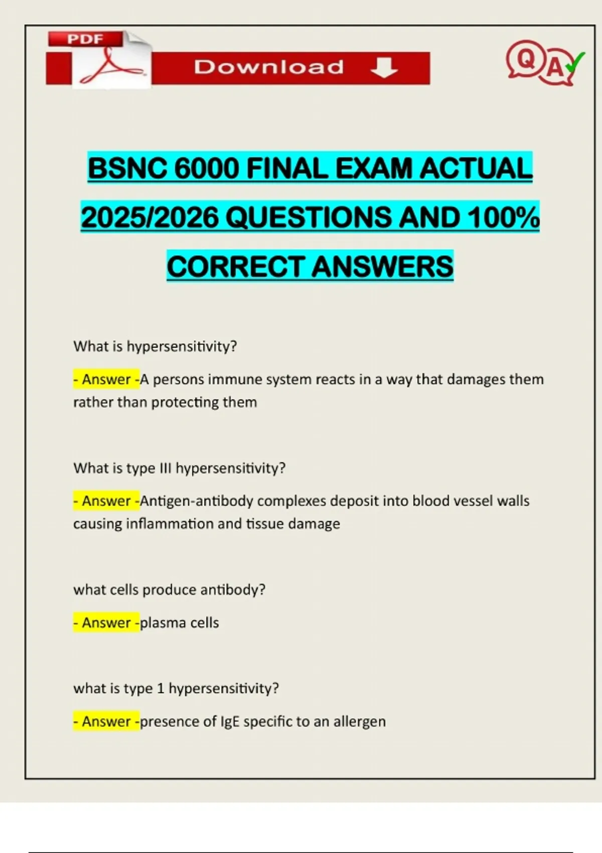 BSNC 6000 FINAL EXAM ACTUAL 2025/2026 QUESTIONS AND 100% CORRECT ANSWERS What is hypersensitivity? - Answer -A persons immune system reacts in a way that damages them rather than protecting them What is type III hypersensitivity? - Answer -Antigen-antibody complexes deposit into blood vessel walls causing inflammation and tissue damage what cells produce antibody? - Answer -plasma cells what is type 1 hypersensitivity? - Answer -presence of IgE specific to an allergenNeed assistance on Online classes, Exams & Assignments? Reach out for instant help!! Full Course Assistance, Plagiarism-free Essay Writing, Research Paper, Dissertation, Discussion Posts, etc…. Confidential & Secure services. Tutors are available for all subjects! Email now at: what is the MOI of type 1 hypersensitivity? - Answer -histamine stimulates mucus secretion in the nasal passages and tears that leads to inflammation what are examples of type 1 hypersensitivity? - Answer -(atopic diseases) allergic reactions, asthma, dermatitis, and anaphylaxis what is the immune mechanism of type II hypersensitivity? - Answer -anti-body mediated immune reaction where antibodies li