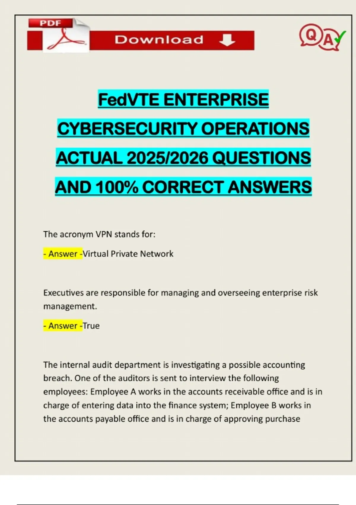 FedVTE ENTERPRISE CYBERSECURITY OPERATIONS ACTUAL 2025/2026 QUESTIONS AND 100% CORRECT ANSWERS The acronym VPN stands for: - Answer -Virtual Private Network Executives are responsible for managing and overseeing enterprise risk management. - Answer -True The internal audit department is investigating a possible accounting breach. One of the auditors is sent to interview the following employees: Employee A works in the accounts receivable office and is in charge of entering data into the finance system; Employee B works in the accounts payable office and is in charge of approving purchaseNeed assistance on Online classes, Exams & Assignments? Reach out for instant help!! Full Course Assistance, Plagiarism-free Essay Writing, Research Paper, Dissertation, Discussion Posts, etc…. Confidential & Secure services. Tutors are available for all subjects! Email now at: orders; Employee C is the manager of the finance department, supervises Employee A and Employee B, and can perform the functions of both Employee A and Employee B. Which of the following should the auditor suggest be done to avoid future security breaches? - Answer -The manager should only be able to review the data and approve purchase orders. An electrical utility has employed a consultant to perform a controls assessment of the personnel system, ba