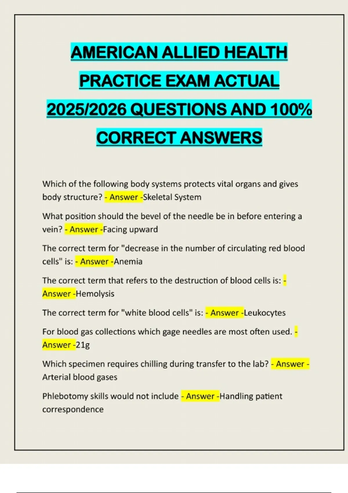 AMERICAN ALLIED HEALTH PRACTICE EXAM ACTUAL 2025/2026 QUESTIONS AND 100% CORRECT ANSWERS Which of the following body systems protects vital organs and gives body structure? - Answer -Skeletal System What position should the bevel of the needle be in before entering a vein? - Answer -Facing upward The correct term for "decrease in the number of circulating red blood cells" is: - Answer -Anemia The correct term that refers to the destruction of blood cells is: - Answer -Hemolysis The correct term for "white blood cells" is: - Answer -Leukocytes For blood gas collections which gage needles are most often used. - Answer -21g Which specimen requires chilling during transfer to the lab? - Answer - Arterial blood gases Phlebotomy skills would not include - Answer -Handling patient correspondenceWhat does CBC stand for? - Answer -Complete blood count What is the functional unit of the nervous system? - Answer -Neuron What promotes the breakdown of glycogen back into glucose? - Answer -Glucagon One group of inherited disorders marked by increased bleeding times is known as: - Answer -Hemophilia At what angle should a venipuncture needle puncture the skin? - Answer -15 to 30 degrees Where should blood never be collected from a patient? - Answer -AV shunt What test is used to diagnose whooping cough, croup, and pneumonia mainly in children? - Answer -NP culture The correct term for "a cell that aids in the blood clotting process" is: - Answer -Platelets The middle and ring fingers are the most common digits used to obtain a dermal puncture in adults. - Answer -True The most common procedure for collecting many types of urine specimens is known as the: - Answer -Midstream clean catch HIPAA is: - Answer -Designed to keep personal health information private Which is not a laboratory test that assesses for muscle disorders? - Answer -C&S Hepatitis involves which organ? - Answer -Liver