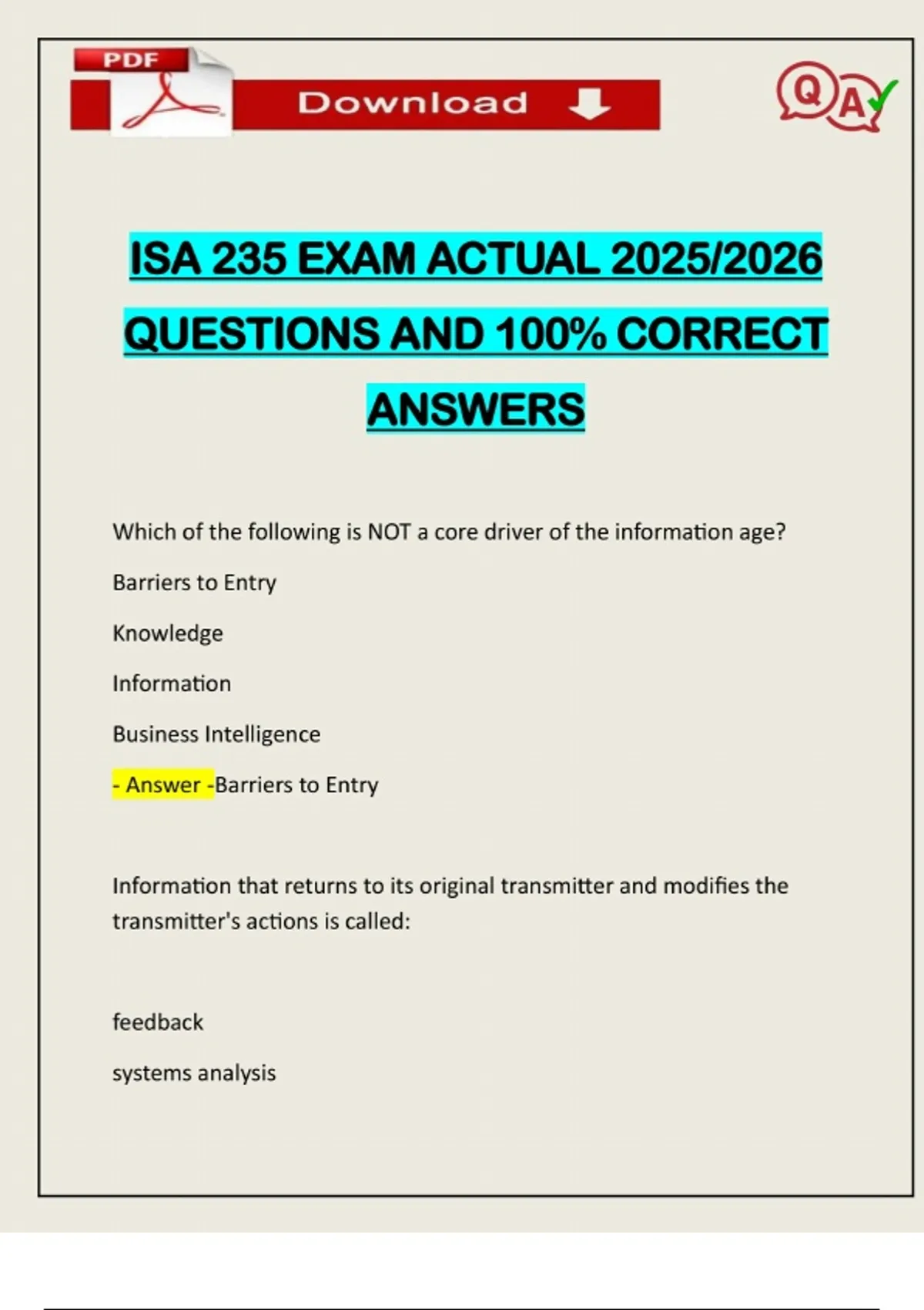 ISA 235 EXAM ACTUAL 2025/2026 QUESTIONS AND 100% CORRECT ANSWERS Which of the following is NOT a core driver of the information age? Barriers to Entry Knowledge Information Business Intelligence - Answer -Barriers to Entry Information that returns to its original transmitter and modifies the transmitter's actions is called: feedback systems analysisNeed assistance on Online classes, Exams & Assignments? Reach out for instant help!! Full Course Assistance, Plagiarism-free Essay Writing, Research Paper, Dissertation, Discussion Posts, etc…. Confidential & Secure services. Tutors are available for all subjects! Email now at: knowledge a data loop - Answer -feedback One difference between a CIO and a CTO is that: the CTO typically reports to the CEO, while the CIO