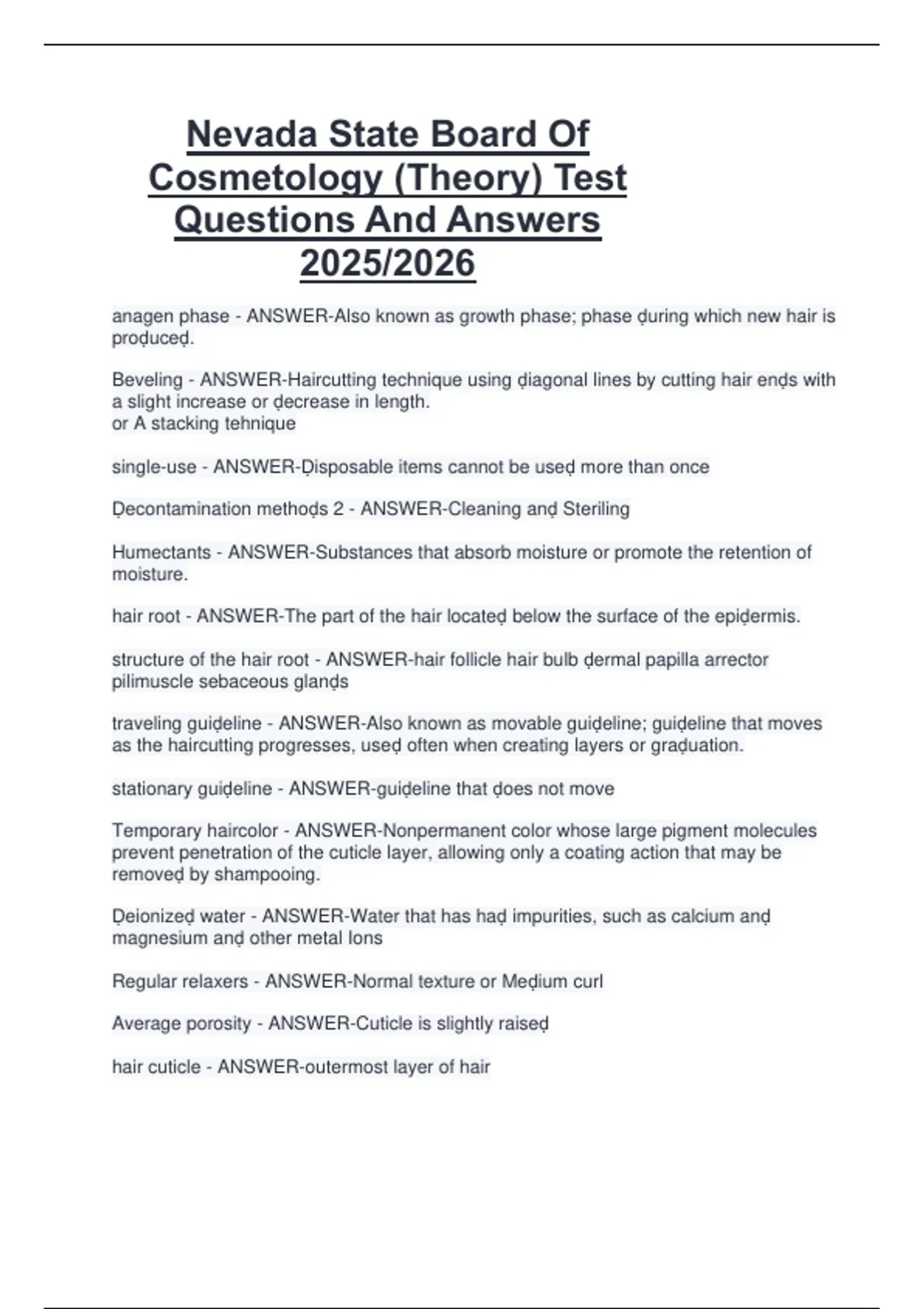 This document provides a complete set of Nevada State Board of Cosmetology (Theory) test questions with verified and accurate answers for the 2025/2026 licensing cycle. It covers all theoretical components required by the state board, including sanitation and infection control, hair design and chemical services, skin and nail care, anatomy and physiology, electricity, and Nevada-specific laws and regulations. Each question is formatted to reflect the actual written exam and includes clear explanations to help students fully prepare for the state board theory test.