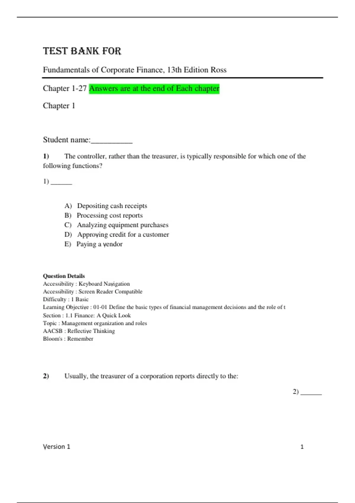 1) The controller, rather than the treasurer, is typically responsible for which one of the