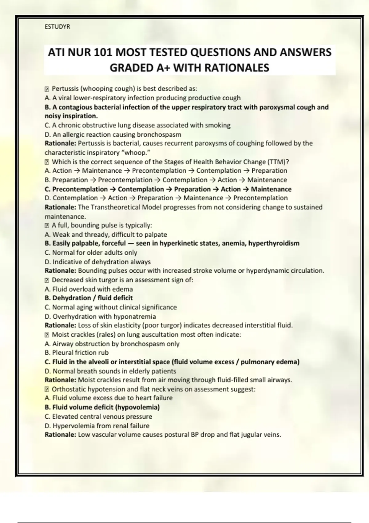 ATI NUR 101 MOST TESTED QUESTIONS AND ANSWERS GRADED A+ WITH RATIONALES