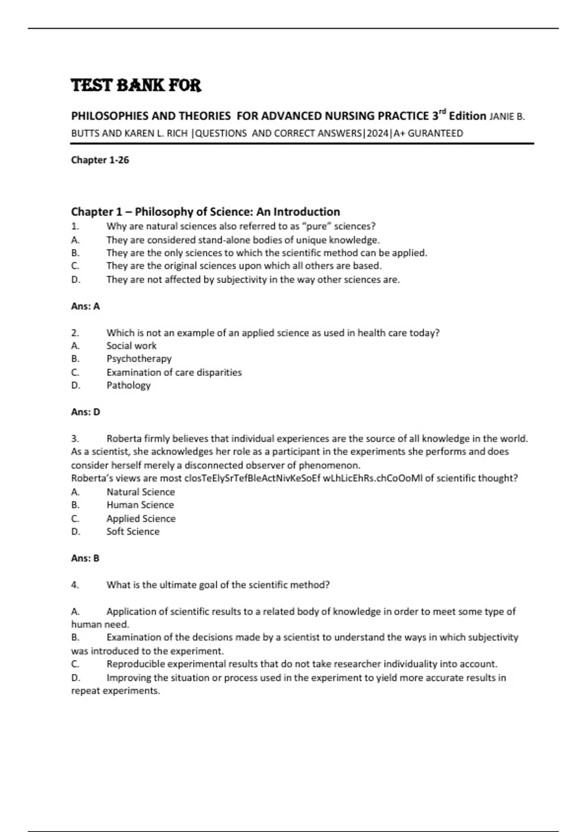 PHILOSOPHIES AND THEORIES FOR ADVANCED NURSING PRACTICE 3rd Edition BY JANIE B. BUTTS AND KAREN L. RICH QUESTIONS AND CORRECT ANSWERS2024A+ GURANTEED Test Bank
