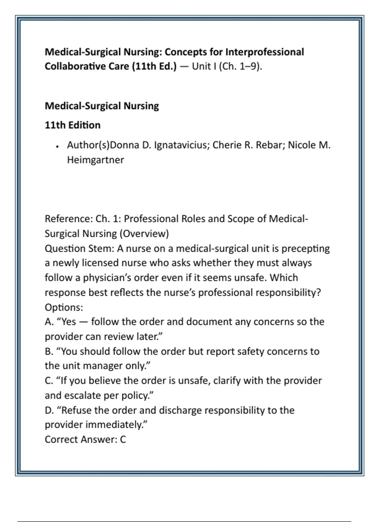 Medical-Surgical Nursing Test Bank — Ignatavicius 11th Edition | 20 NCLEX/HESI Qs per Chapter, Verified Rationales for NCLEX Review Description: Struggling with test anxiety, endless content, or knowing which med-surg concepts are high-yield for licensure? The Medical-Surgical Nursing Test Bank — built on Ignatavicius 11th Edition — gives you a proven, chapter-by-chapter study system aligned to the 2025 NCLEX-RN Test Plan and HESI competencies. Each chapter contains 20 original NCLEX/HESI-style multiple-choice questions (single-best answer) that emphasize clinical judgment, patient safety, pharmacology application, and interprofessional collaborative care. Every item includes clear, evidence-based explanations — Verified Rationales written and peer-reviewed by nurse educators — so you learn why each answer is correct and how to apply concepts at the bedside. What you’ll get: • Complete coverage: 20 MCQs per chapter mapped precisely to Ignatavicius 11th Edition content, covering pathophysiology, assessment, diagnostics, and nursing interventions. • Exam-focused design: question stems mirror NCLEX Review and HESI cognitive levels (application → analysis → evaluation) to build higher-order thinking. • Actionable feedback: rationales include clinical cues, distractor analysis, and concise teaching points for immediate remediation. • Flexible formats: printable quizzes, CSV/LMS import, and group-study packets for instructors. Who it’s for: RN and BSN students preparing for licensure exams, MSN candidates needing targeted med-surg review, remediation coordinators, and nursing educators seeking validated test items. Why it works: This test bank reduces guesswork by pairing exam-style items with Verified Rationales and educator-validated alignment to current NCLEX/HESI frameworks. Regular practice strengthens clinical judgment, improves time management, and increases confidence for exam day. All questions are evidence-based and reviewed by experienced nurse educators with active clinical practice and exam-writing expertise. Sample question types include priority-setting scenarios, medication-safety calculations, delegation and supervision cases, and complex pathophysiology vignettes — designed to mirror real-world nursing decisions. Educators can also use embedded teaching points to create learning modules and facilitate debriefing. Purchase includes lifetime access to updates tied to the Ignatavicius 11th Edition curriculum, plus instructor licensing options for classroom use. Start practicing with confidence and make every study hour count. Use this as your definitive NCLEX Review tool — start preparing smarter today! Hashtags (10): [#NCLEX #NursingStudents #MedSurgNursing #HESIReview #Ignatavicius11thEdition #NursingSchool #RNExamPrep #TestBank #StudySmarter #NursingEducation] Keywords (20): [Medical Surgical Nursing Test Bank, Ignatavicius 11th Edition questions, NCLEX Med-Surg review, HESI practice questions, verified rationales, nursing exam prep, clinical judgment MCQs, RN study guide, medical-surgical care review, evidence-based nursing test bank, Ignatavicius test questions, HESI Med-Surg practice, nursing test bank download, NCLEX Review questions, interprofessional collaborative care study guide, patient safety NCLEX questions, pharmacology for med-surg MCQs, priority-setting nursing questions, med-surg practice exam, instructor-ready nursing test bank]