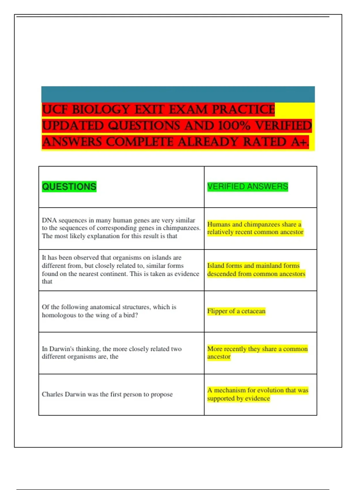 UCF BIOLOGY EXIT EXAM STUDY GUIDE UPDATED QUESTIONS AND 100% VERIFIED ANSWERS COMPLETE ALREADY RATED A+.