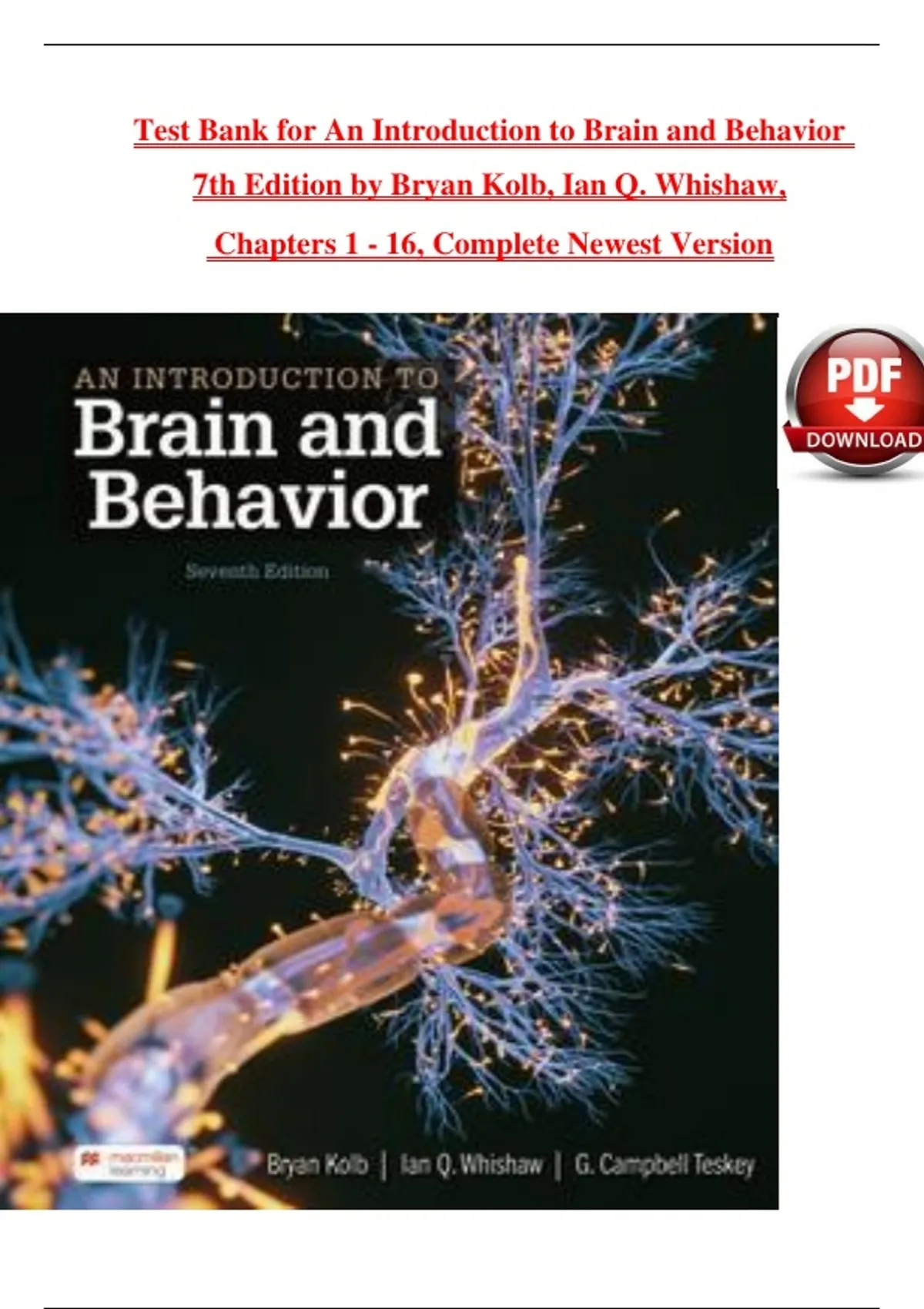 Access the complete test bank for An Introduction to Brain and Behavior 7th Edition by Bryan Kolb, Ian Q. Whishaw, and G. Campbell Teskey. Includes all chapters (1-16) with multiple-choice questions and answers for effective study and exam preparation.
