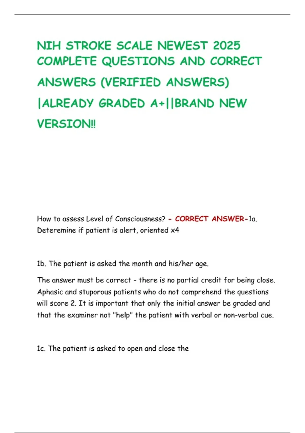 NIH STROKE SCALE NEWEST 2025 COMPLETE QUESTIONS AND CORRECT ANSWERS (VERIFIED ANSWERS) |ALREADY GRADED A+||BRAND NEW VERSION!!