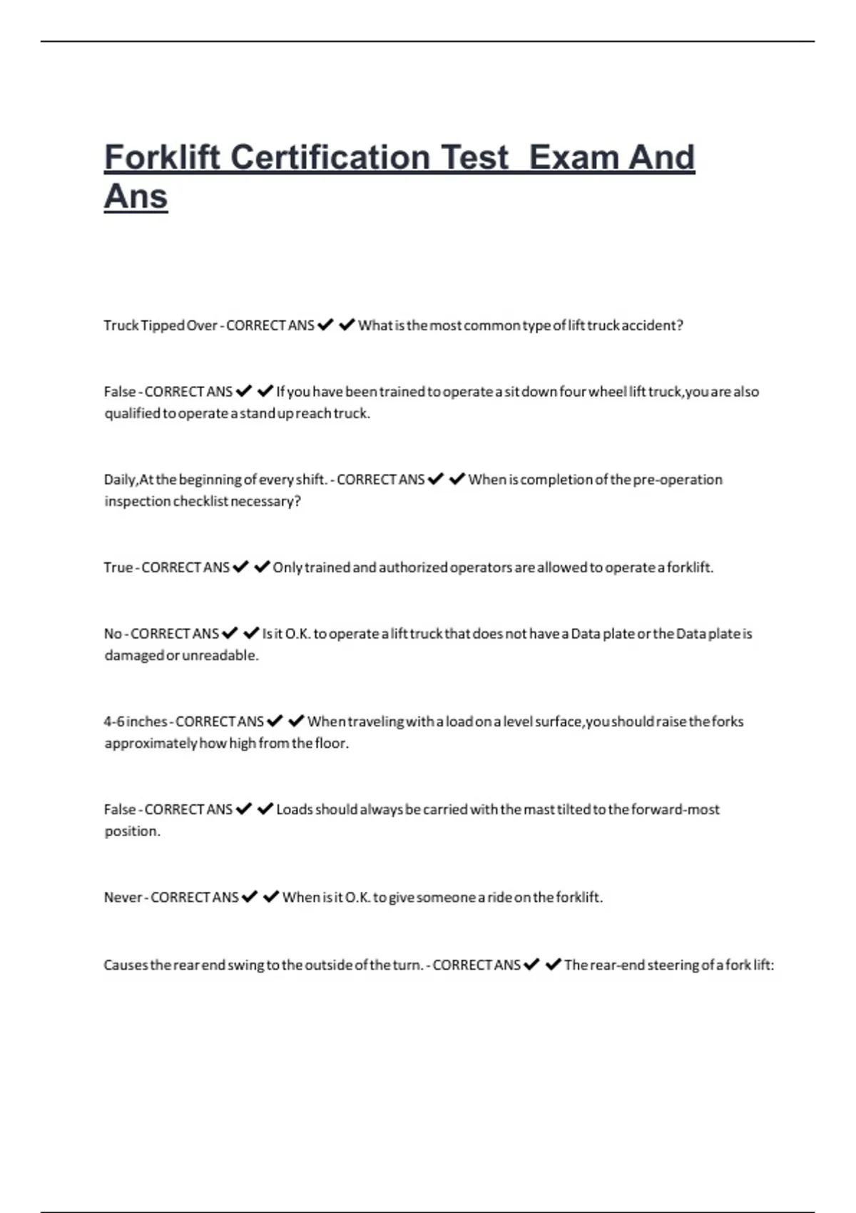 True - CORRECT ANS✔✔Only trained and authorized operators are allowed to operate a forklift.