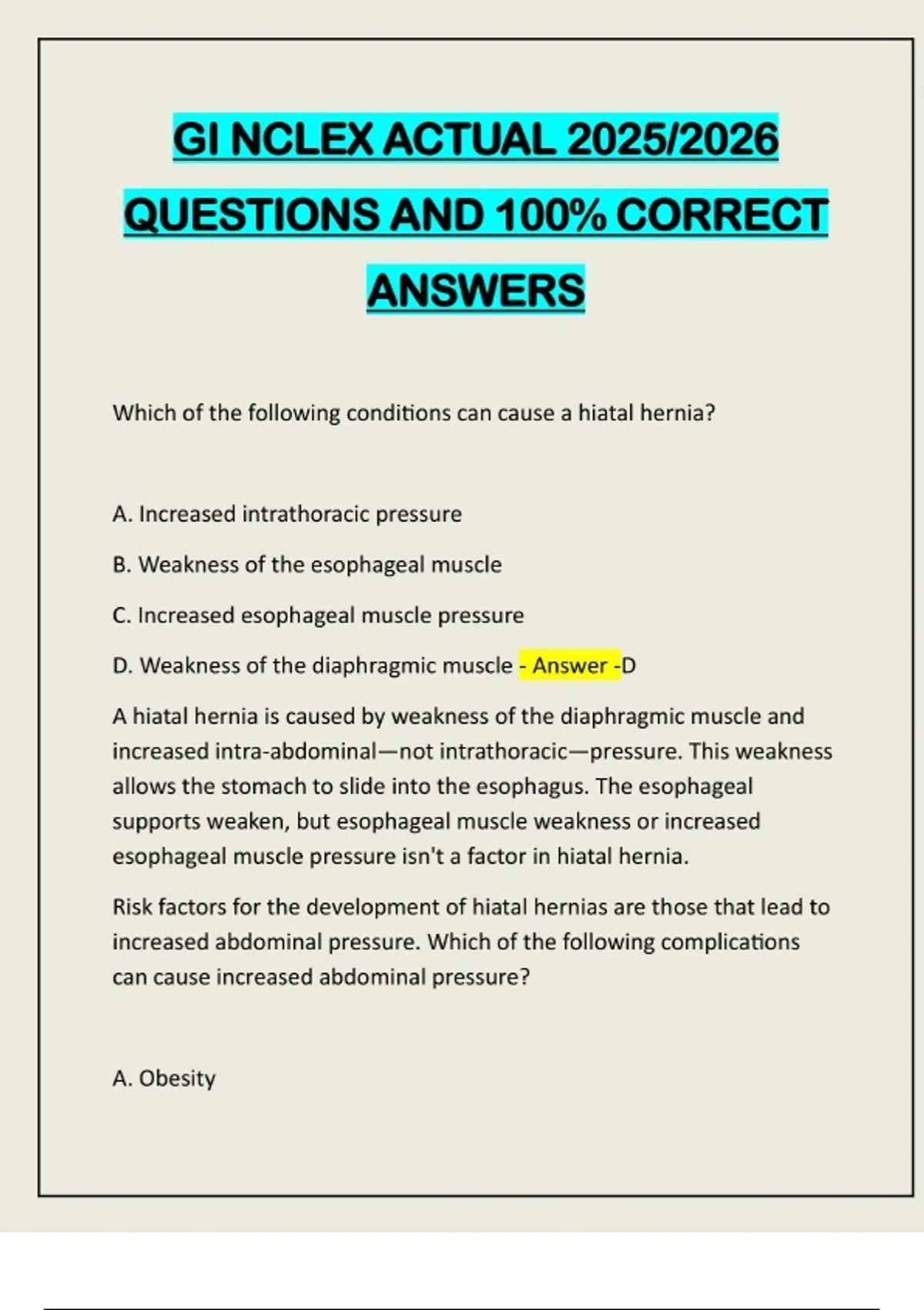 INTEG NCLEX 6/15/20 ATI PRACTICE ASSESSMENT ACTUAL 2025/2026 QUESTIONS AND 100% CORRECT ANSWERS A nurse is caring for a client who has a surgical wound. Which of the following factors places the client at risk for dehiscence? (Select all that apply.) - Answer --Poor nutritional state The client who is malnourished is at risk for dehiscence due to impaired healing. -Obesity The client who is obese is at risk for dehiscence due to poor healing abilities of adipose tissue and the constant strain placed on the incision. -Wound infectionThe client who has a wound infection is at risk for dehiscence due to delayed healing. A nurse is collecting data on a client who has a surgical wound healing by secondary intention. Which of the following findings should the nurse report to the charge nurse? - Answer --The wound has a halo of erythema on the surrounding skin. A ring of redness on the surrounding skin can indicate underlying infection, and the nurse should report any indication of infection such as purulent drainage, swelling, warmth, or strong odor. A nurse is reinforcing teaching to a client about skin cancer. Which of the following statements by the client indicates a need for further teaching? - Answer --"Eating a high fiber diet will reduce my risk for developing skin cancer." The nurse should inform the client that a high fiber diet is recommended to reduce the risk of colon cancer, not skin cancer. A nurse in a dermatologic clinic is caring for a client who has a malignant melanoma. The nurse should anticipate a prescription for which of the following laboratory test to determine if the melanoma has metastasized? - Answer --Lactic dehydrogenase and aminotransferaseElevations of lactic dehydrogenase and aminotransferase can indicate metastasis to the client's liver. A nurse is discussing alopecia with a client who is to begin chemotherapy. Which of the following statements should the nurse include? - Answer --Hair loss is common and includes eyebrows and eyelashes. The nurse should inform the client that alopecia occurs as a whole-body hair loss for most clients administered chemotherapy. A nurse is reinforcing teaching with a client about the risk factors for skin cancer. Which of the following statements by the client indicates an understanding of the teaching? - Answer --"I need to use sunscreen even in winter." The client should use sunscreen daily to minimize the negative effects of ultraviolet rays. The vast majority of cases of skin cancer diagnosed each year are considered to be sun related. A nurse is caring for a client following the application of an aquathermia pad. Which of the following manifestations should the nurse identify as an indication that the client has a superficial burn? - Answer --Erythema Erythema is a manifestation of a superficial burn. A nurse is assisting with the care of a client who has partial-thickness and full-thickness burns to his upper torso and face. Which of thefollowing action should the nurse take to prevent infection? - Answer -- Change gloves between sites when providing wound care to multiple wounds. To prevent cross-contamination of wounds, the nurse should wear sterile gloves during all dressing changes and wound care activities. The nurse should change gloves when providing wound care to a new wound site on a different area of the client's body. A nurse is contributing to the plan of care for a client who has a spinal cord injury and paralysis. Which of the following actions should the nurse include in the plan to decrease the client's risk of skin breakdown? (Select all that apply.) - Answer --Use pillows to keep heels off the bed surface