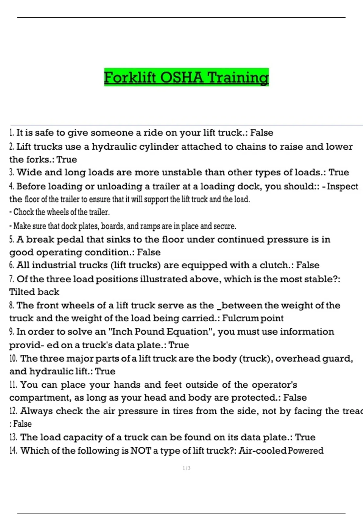 This document provides a full OSHA-compliant training guide for forklift operators, including key safety principles, regulations, and best practices. It covers topics such as load handling, pre-operation inspections, hazard recognition, safe driving techniques, and OSHA 29 CFR 1910.178 requirements. The guide also includes practice test questions with correct answers to help trainees prepare for official forklift certification or refresher training. Ideal for warehouse staff, operators, and safety managers seeking OSHA compliance.